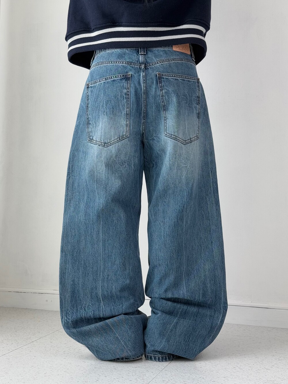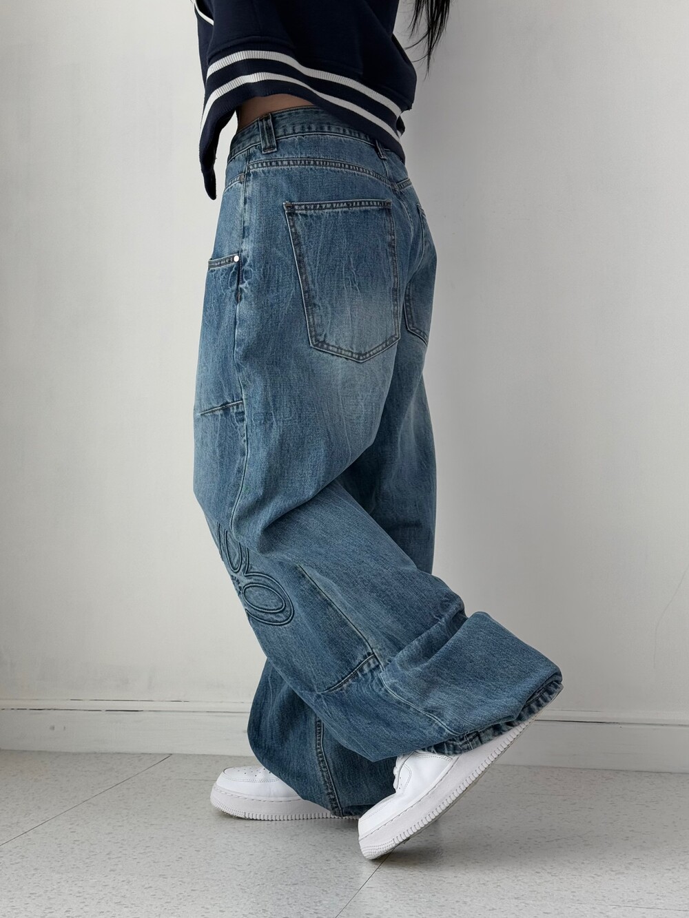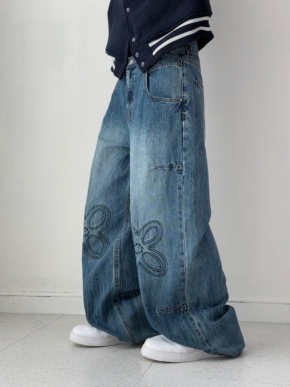 •귀여운 플라워 패턴이 쫑쫑>,< 포인트로 착용해주시기 좋은 데님팬츠에요! 와이드묵직핏입니닷. 데님 치곤 무겁지 않은편이라 활동하실때도 편하실거에요!
