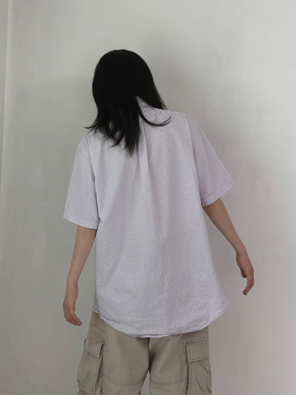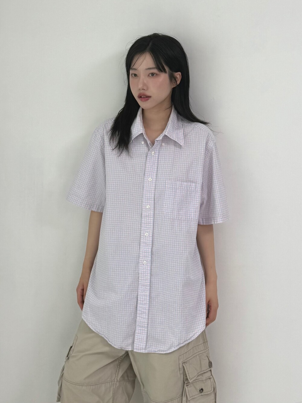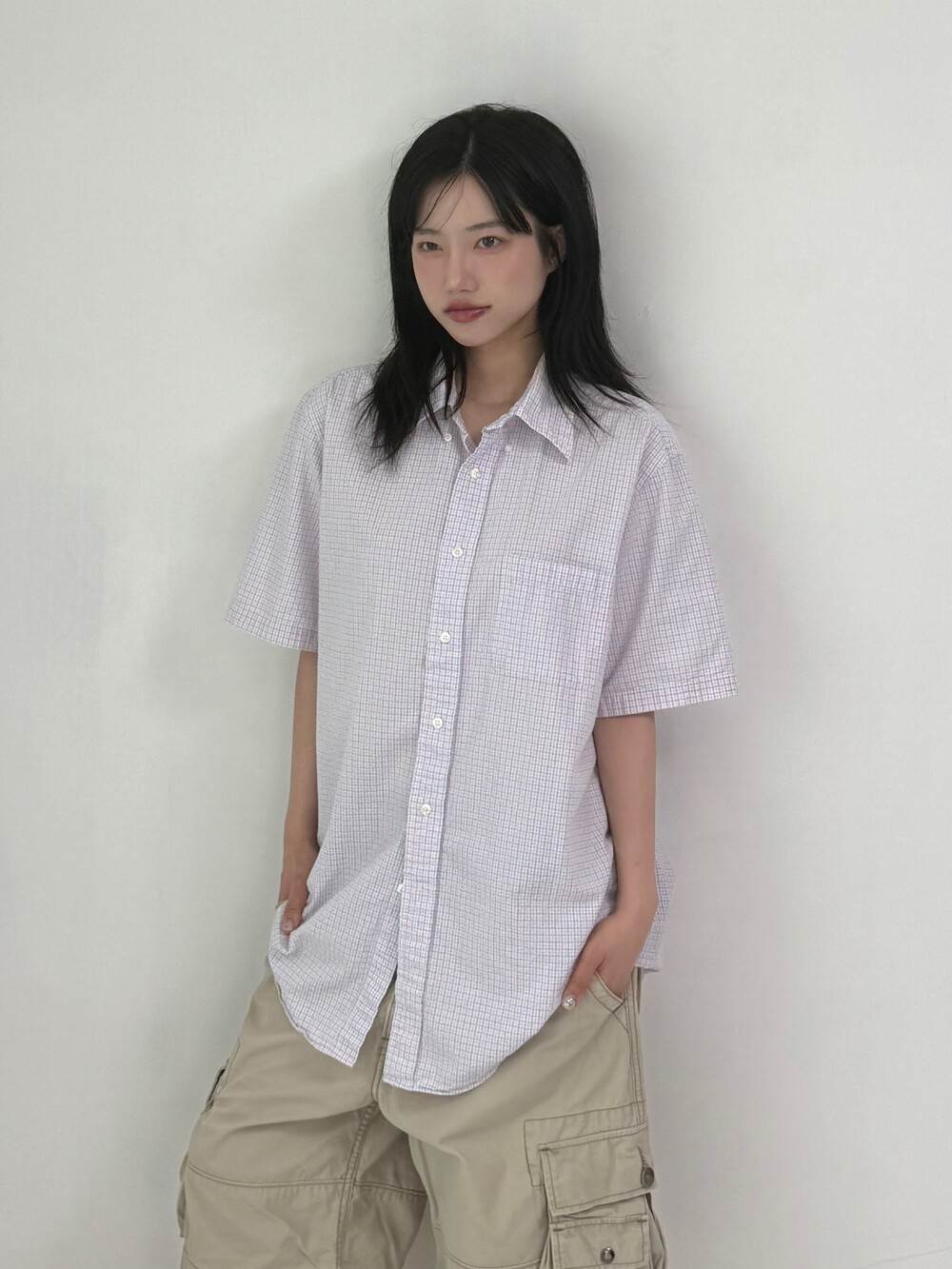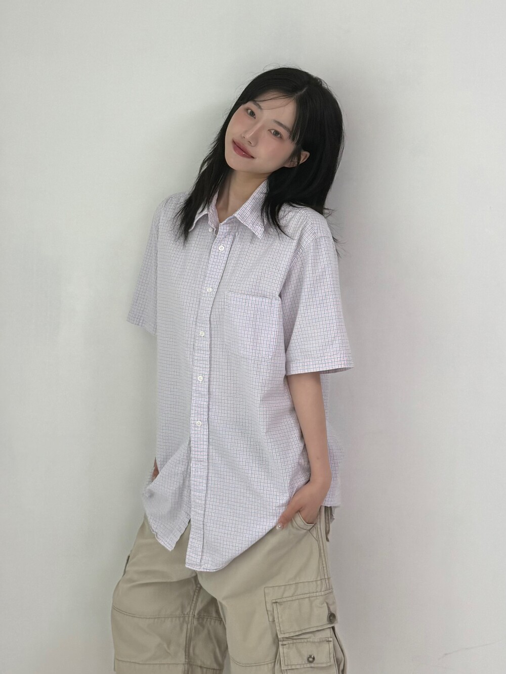 •은은한 핑크컬러가 사랑스러운 반팔 체크셔츠 입니다ㅎㅎ 오버핏이라 단독으로 입어주셔도 좋고 반팔과 레이어드해서 입어주셔도 굿!