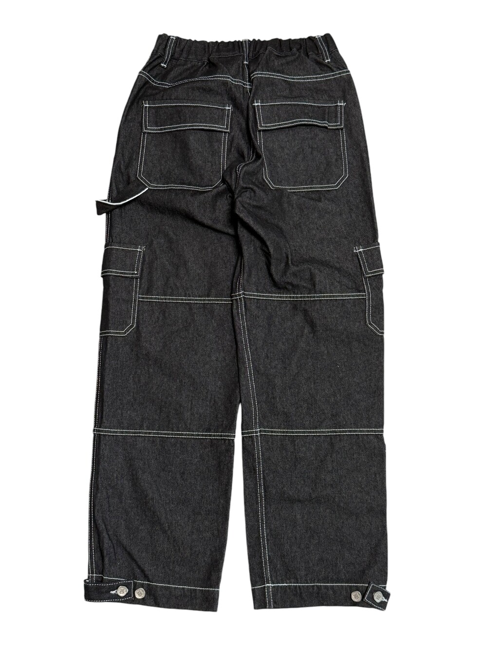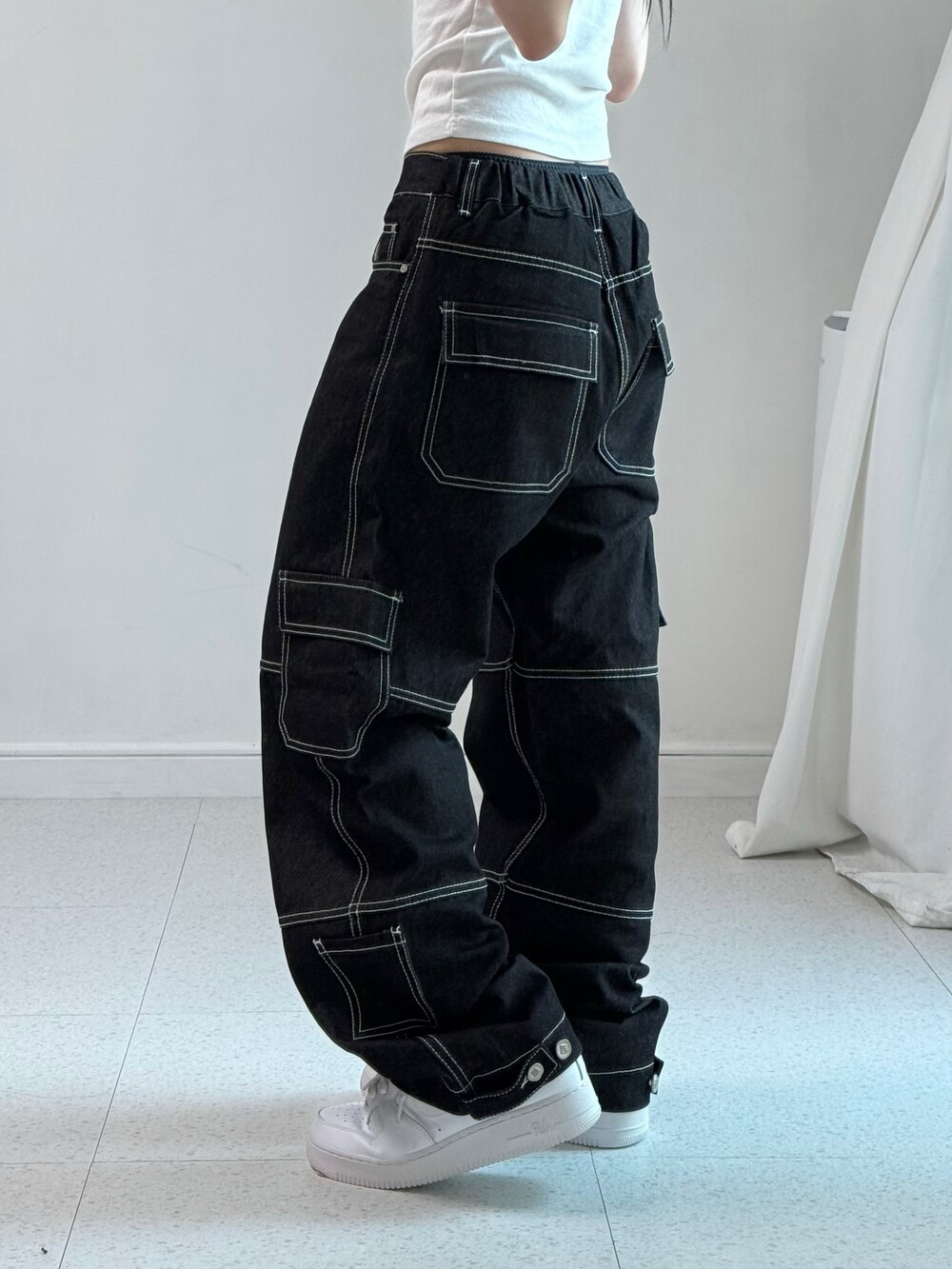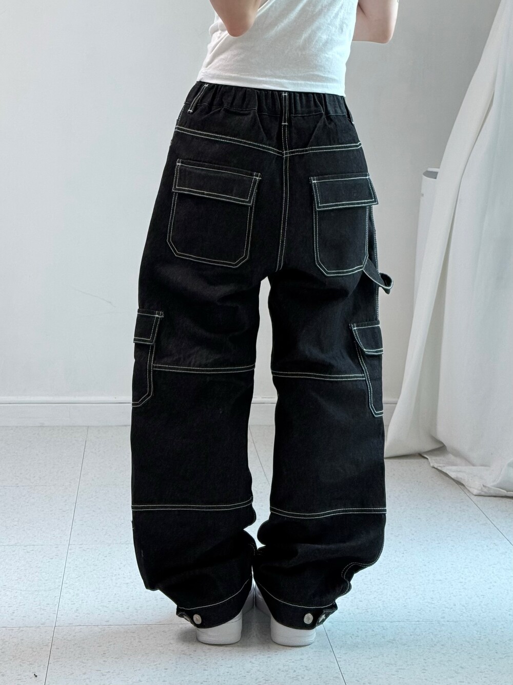 •깔끔한 블랙 컬러에 화이트 스티치로 포인트가 들어간 카펜터 카고팬츠에요! 허리는 부분밴딩이라 편안하게 착용해주시기 넘 좋습니다 👍🏻
