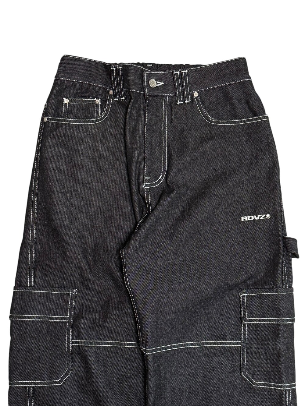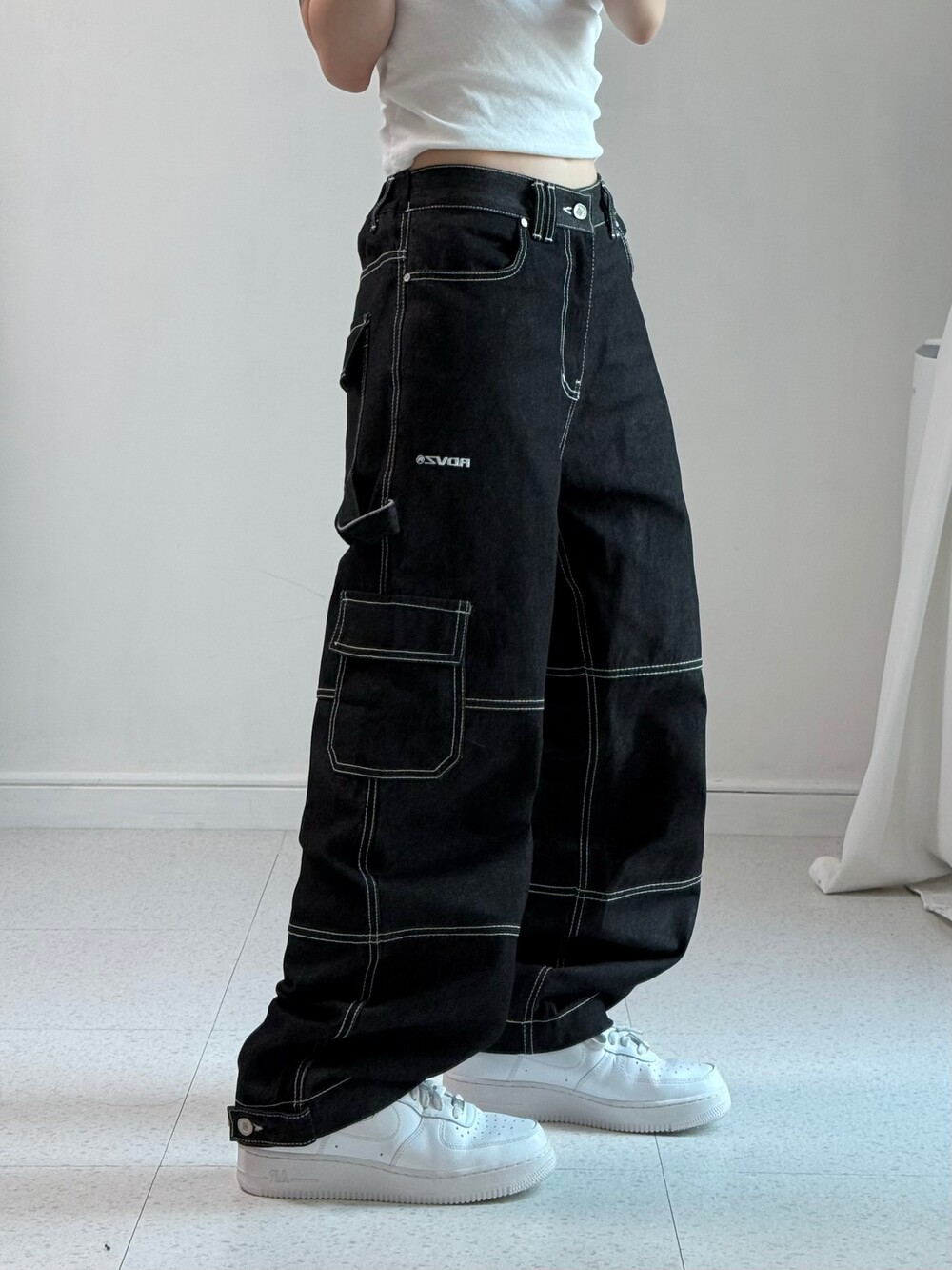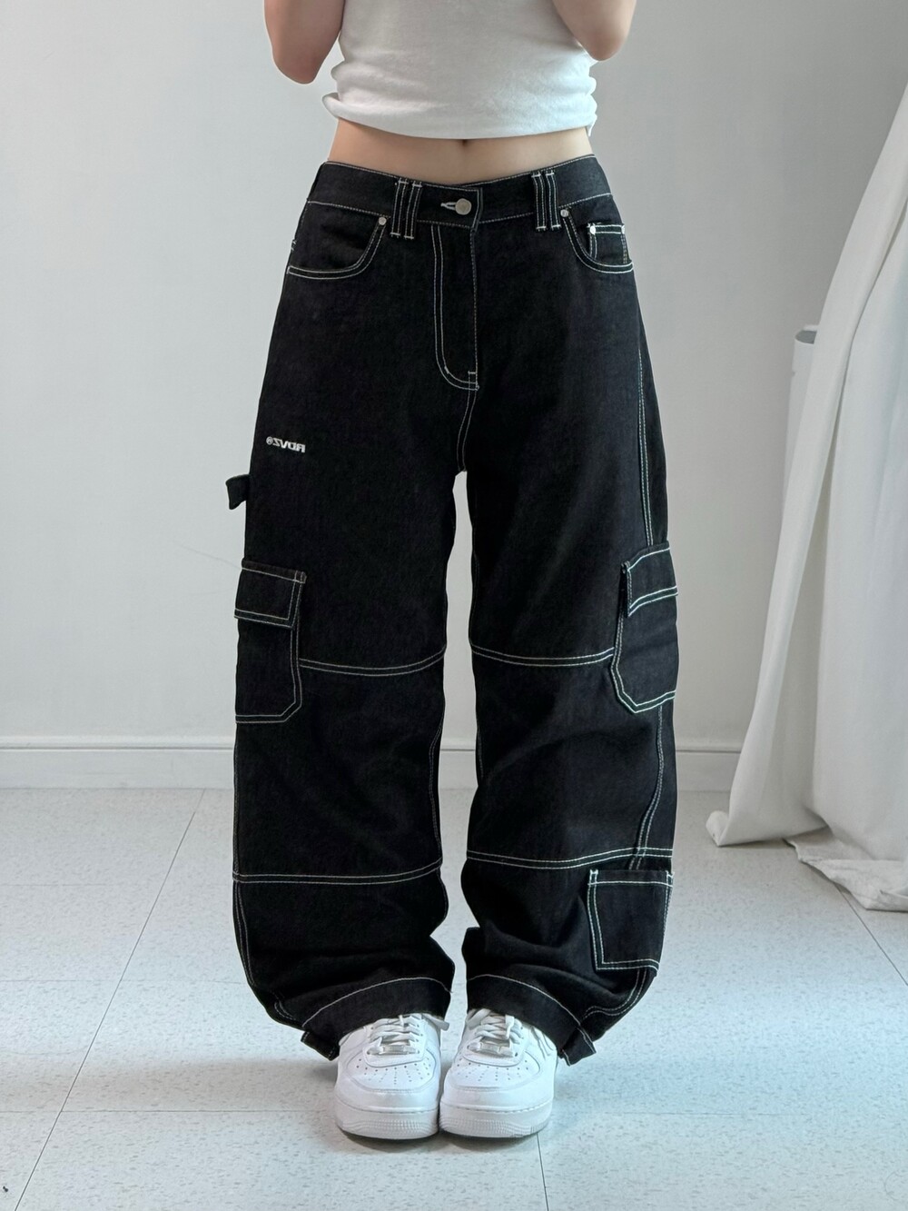 •깔끔한 블랙 컬러에 화이트 스티치로 포인트가 들어간 카펜터 카고팬츠에요! 허리는 부분밴딩이라 편안하게 착용해주시기 넘 좋습니다 👍🏻