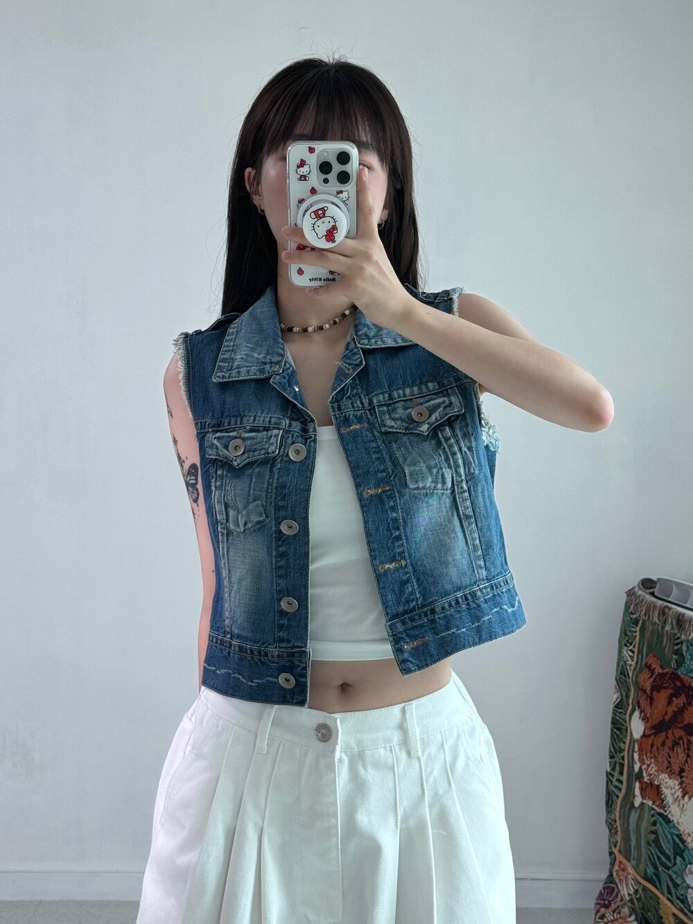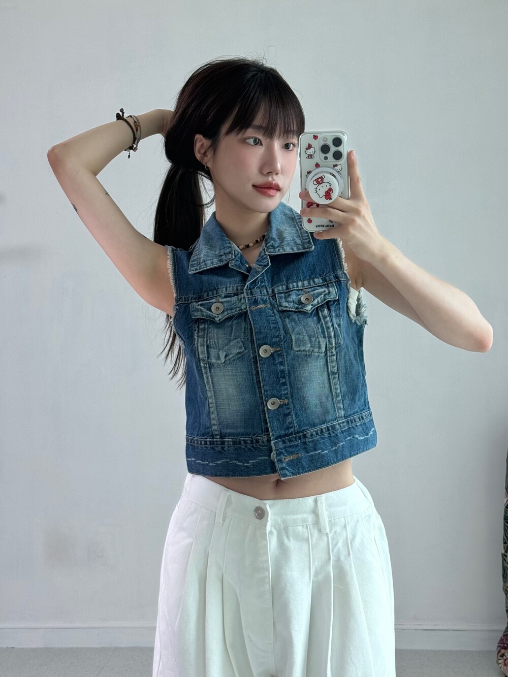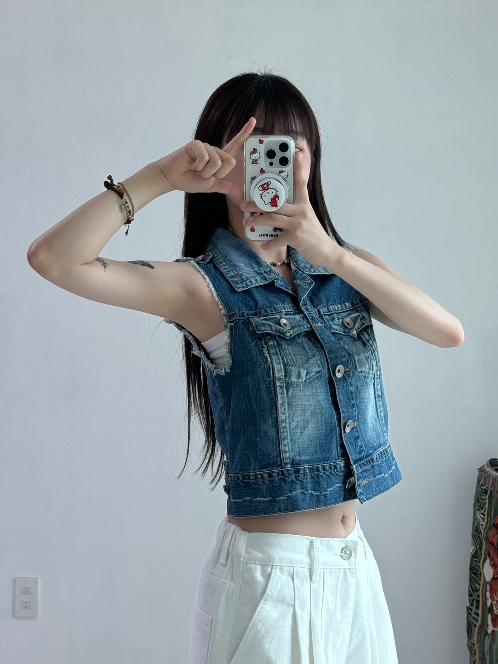 •숏한 기장감과 빈티지한 데미지 디테일이 넘 예쁜 베스트에요! 여름에는 단독으로 가을에는 레이어드로 입어주시면 되는 요물템 이랍니닷 👍🏻
