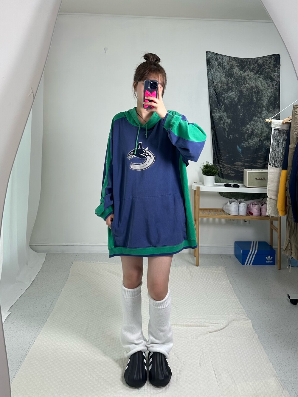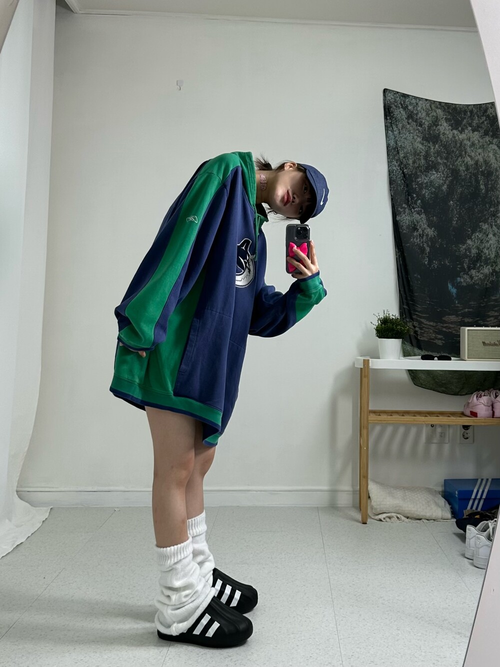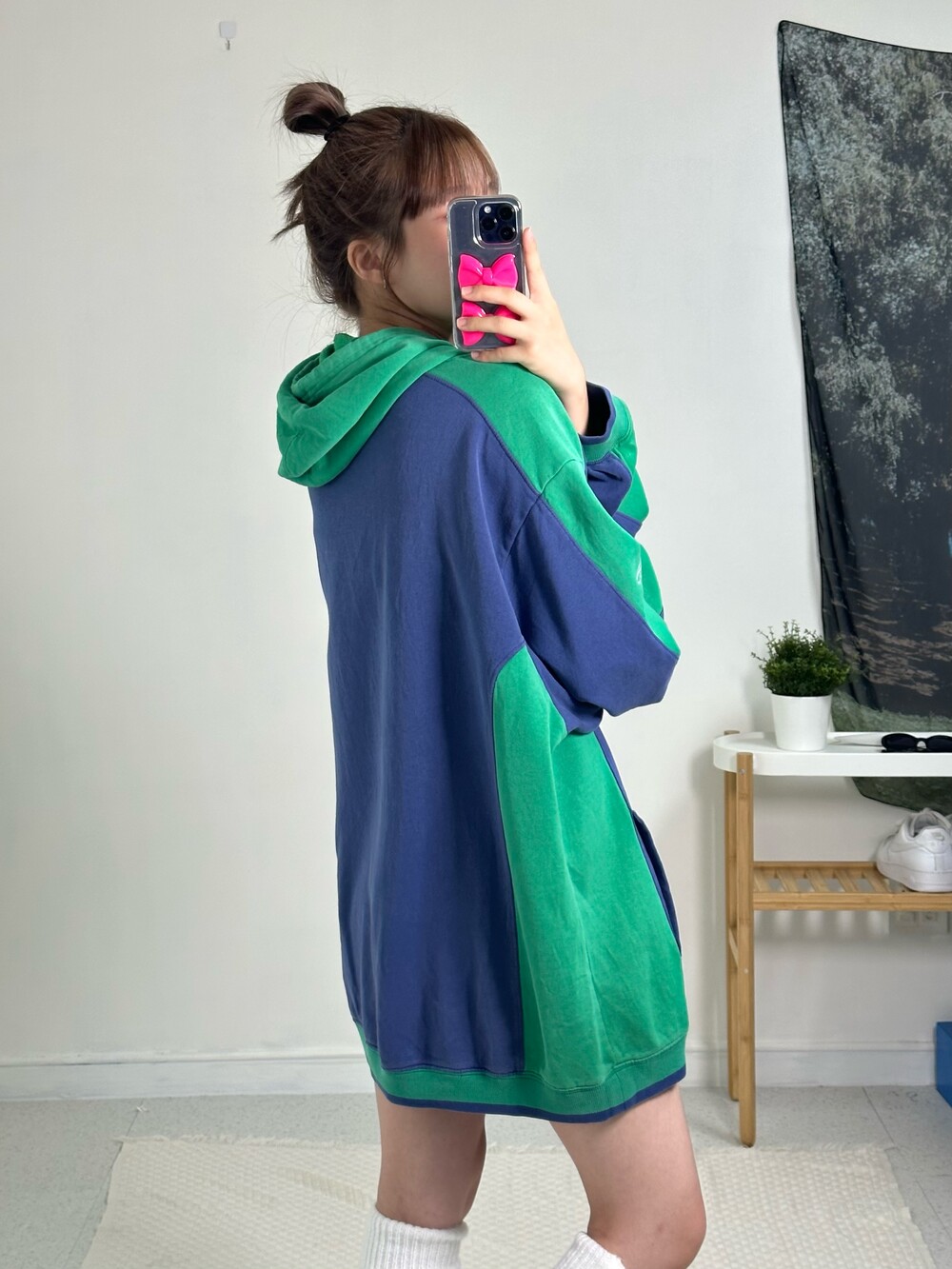 •정말 너무 귀여운 루즈 후드티에요! 초록파랑 조합이라니ㅠㅠ 넘 알록달록하지 않나요- 저처럼 원피스 느낌으로 입어주셔도 좋고 바이커팬츠랑 같이 입어주셔도 좋아요<3