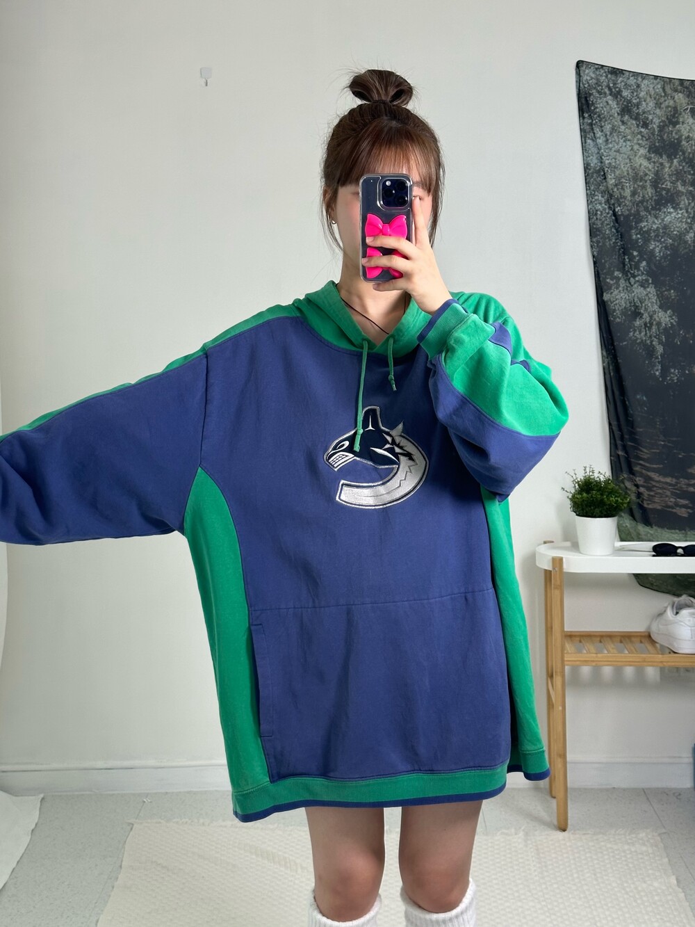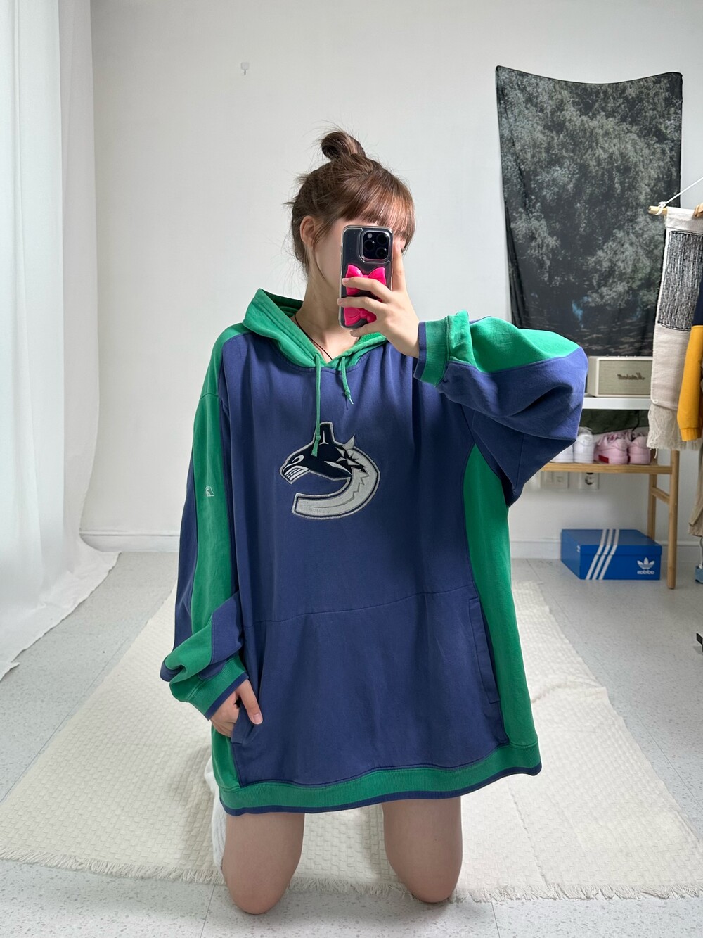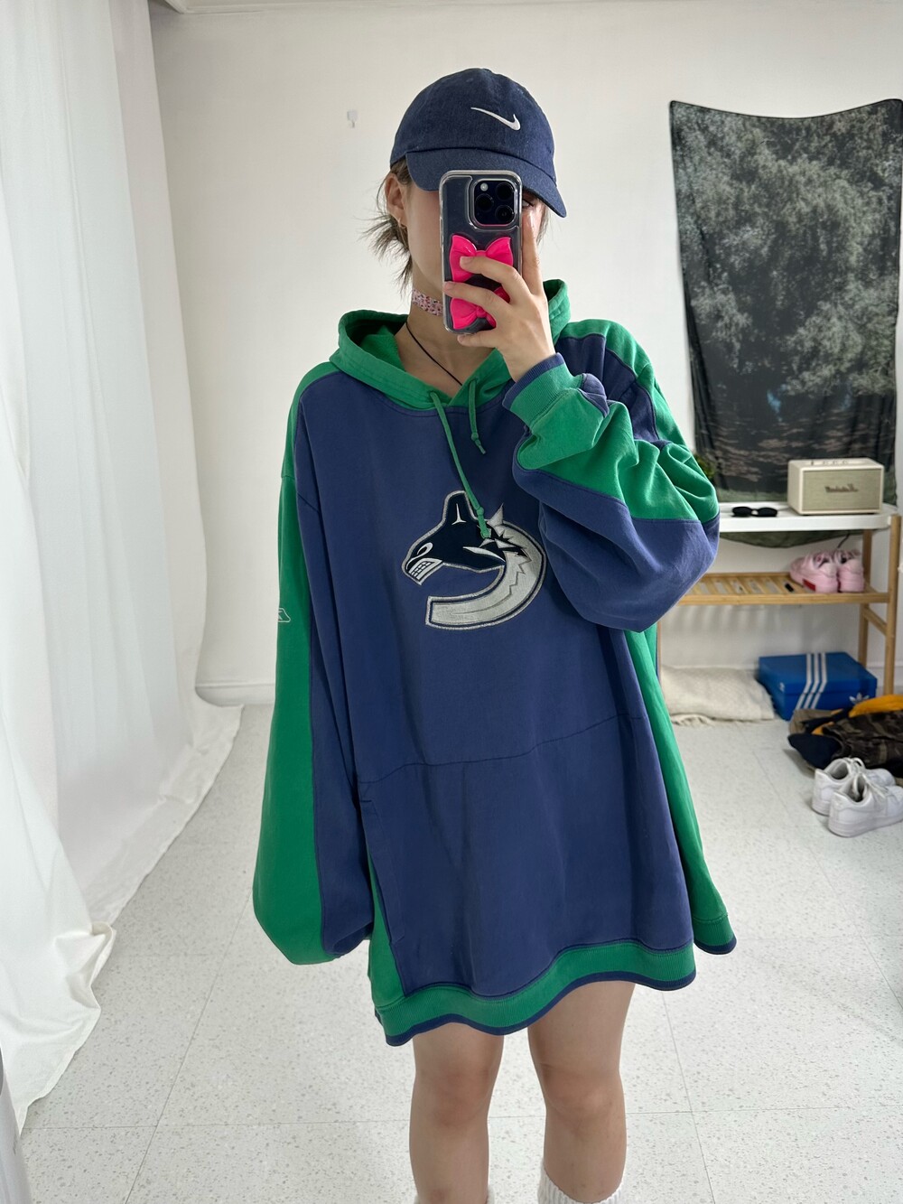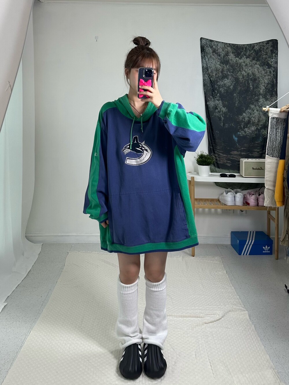 •정말 너무 귀여운 루즈 후드티에요! 초록파랑 조합이라니ㅠㅠ 넘 알록달록하지 않나요- 저처럼 원피스 느낌으로 입어주셔도 좋고 바이커팬츠랑 같이 입어주셔도 좋아요<3