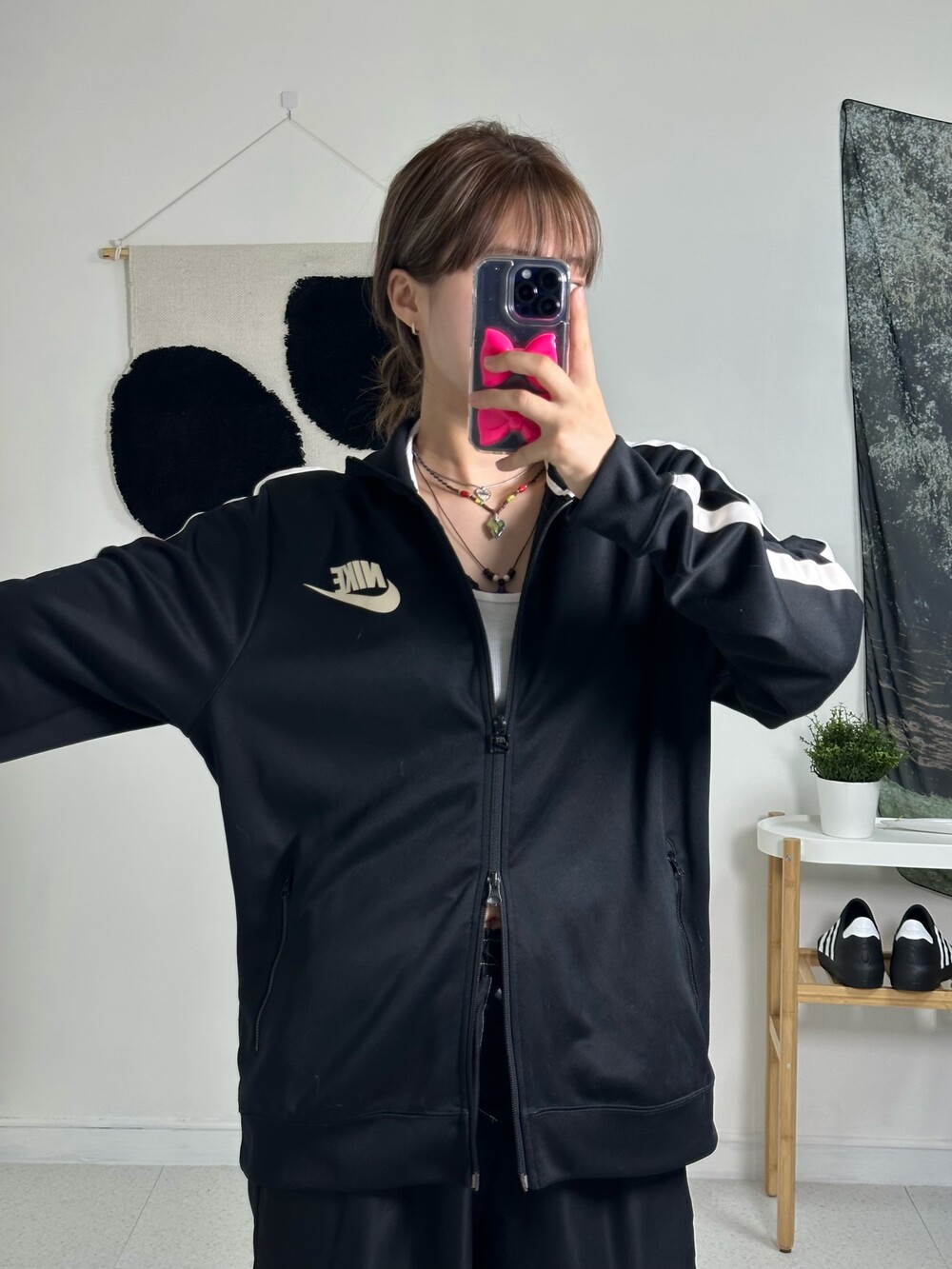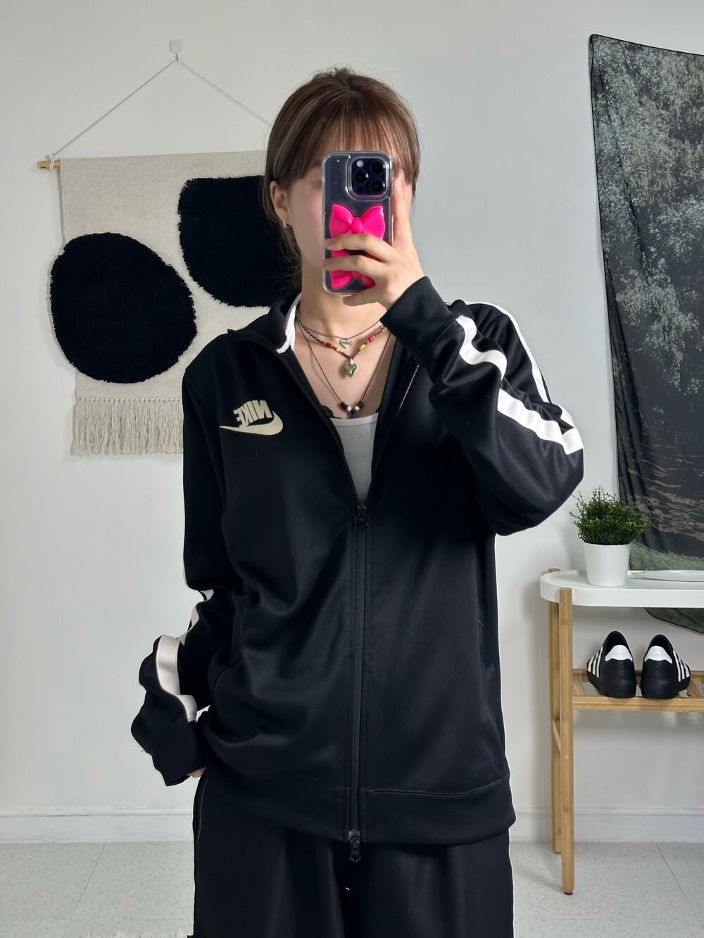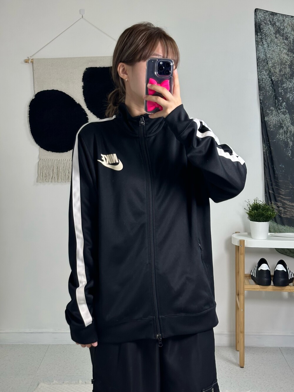 •나이키 빅로고 투웨이져지! 제품샷 보다 착샷이 더 예쁜 제품이에요:) 상체에 루즈하게 떨어지며 나이키 로고가 크게 있어 더욱 포인트가 되더라구요! 투웨이라 다양하게 연출이 가능하고 소매에 사이드라인이 굵게 들어가 있어 더 범고래 느낌 낭낭한 져지에요🖤