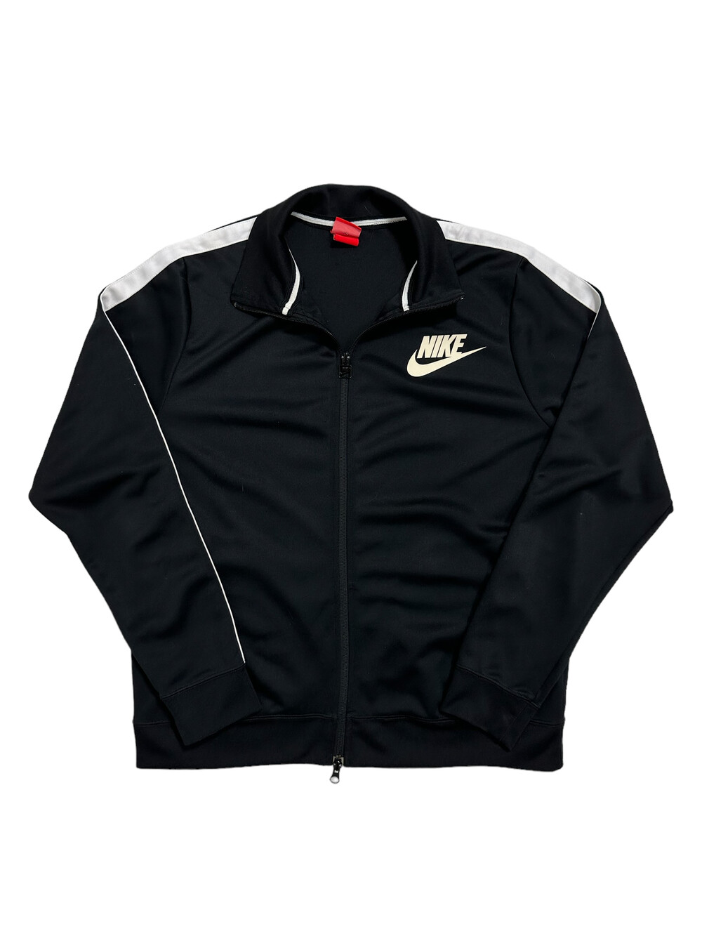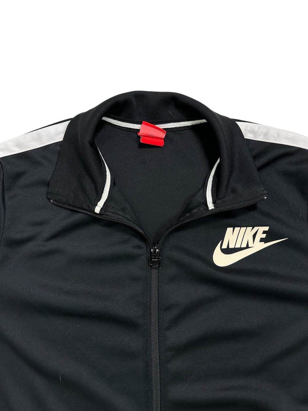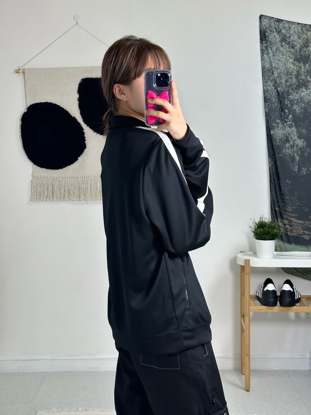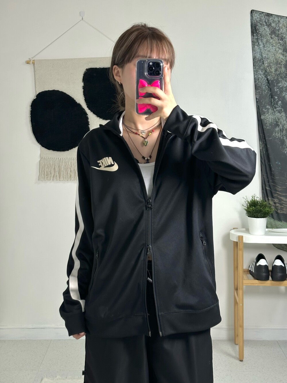 •나이키 빅로고 투웨이져지! 제품샷 보다 착샷이 더 예쁜 제품이에요:) 상체에 루즈하게 떨어지며 나이키 로고가 크게 있어 더욱 포인트가 되더라구요! 투웨이라 다양하게 연출이 가능하고 소매에 사이드라인이 굵게 들어가 있어 더 범고래 느낌 낭낭한 져지에요🖤