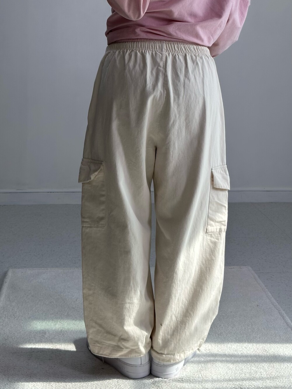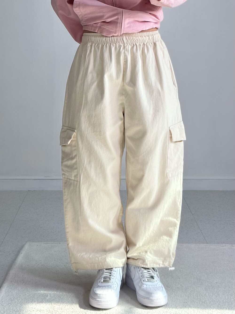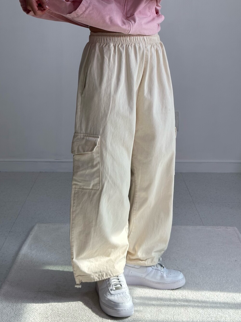 •아방핏 아이보리 벌룬 카고팬츠에요! 밑단 조거로 입으실수도 있는 데일리템 입니다!