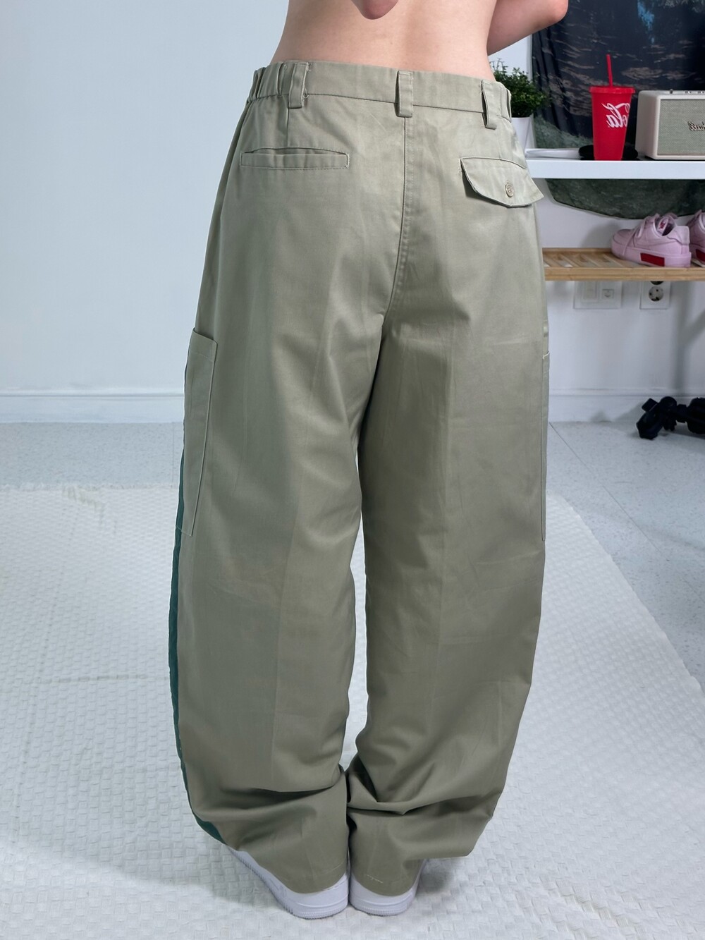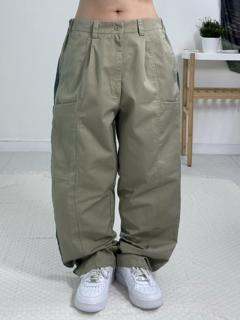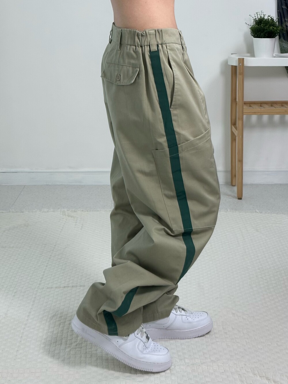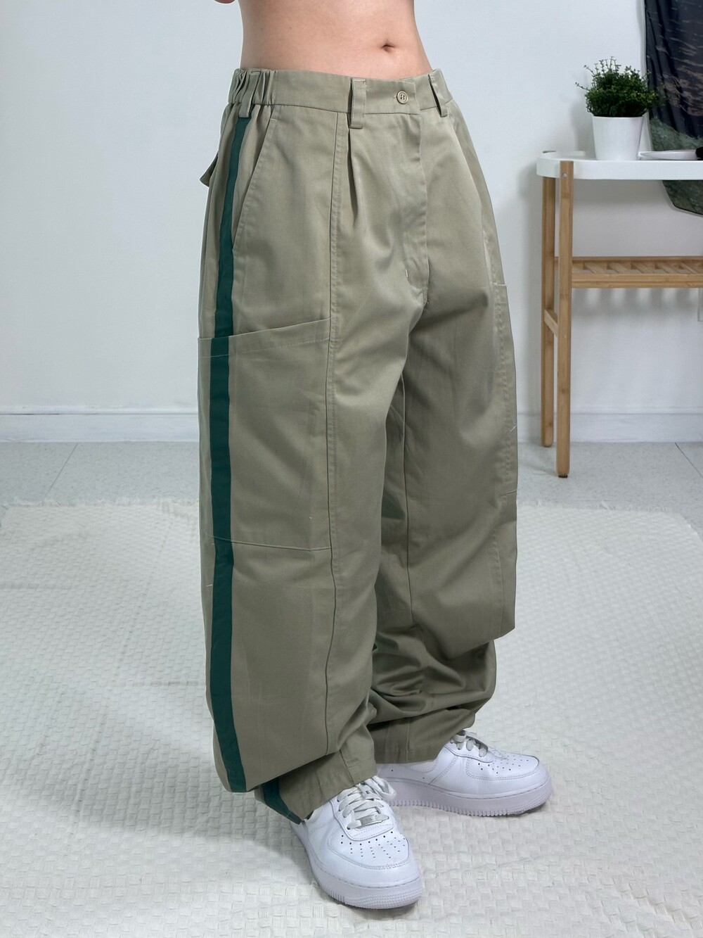 •핀턱 디테일이 잡혀있는 독특한 디자인 카고팬츠에요! 사이드에 빅포켓 디자인이 들어가 있고 초록 라인이 들어가 있어 귀여운 아메카지 스타일로 연출하기 좋답니다:) 사이즈도 아방방하고 전체적으로 깔끔한 핏이라 추천 드립니다!