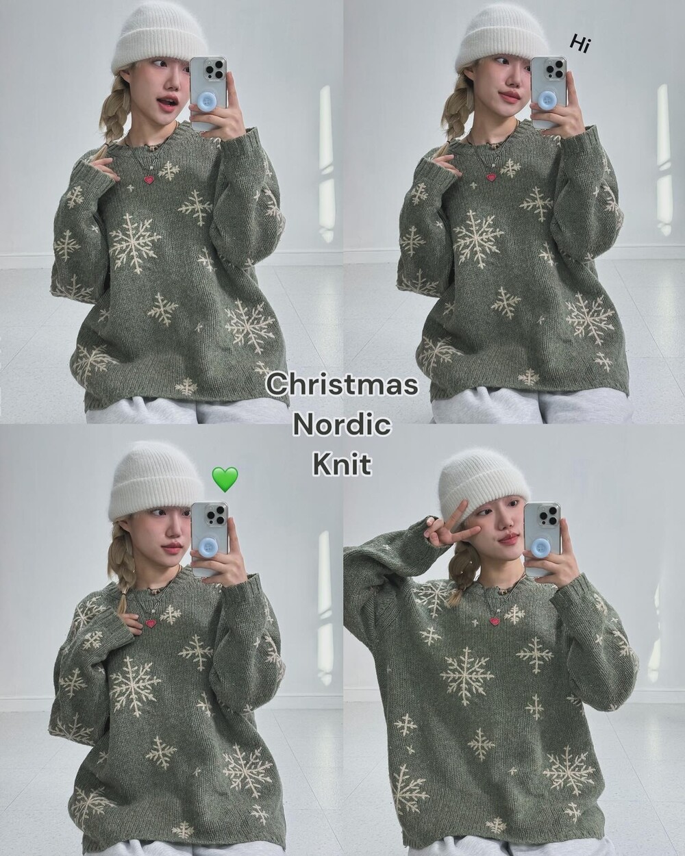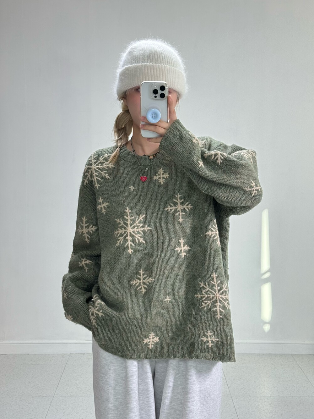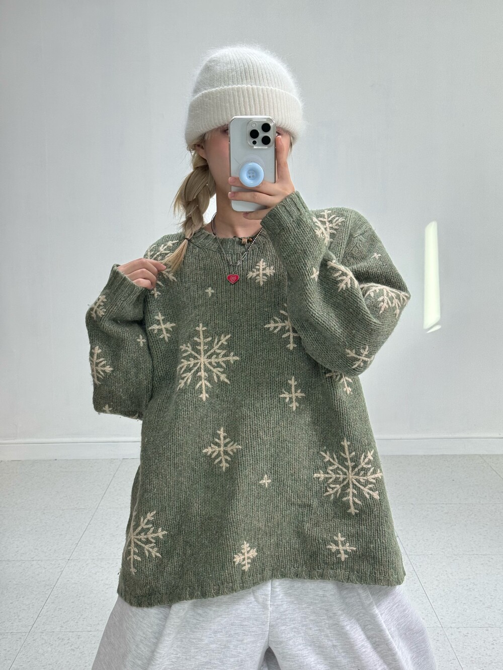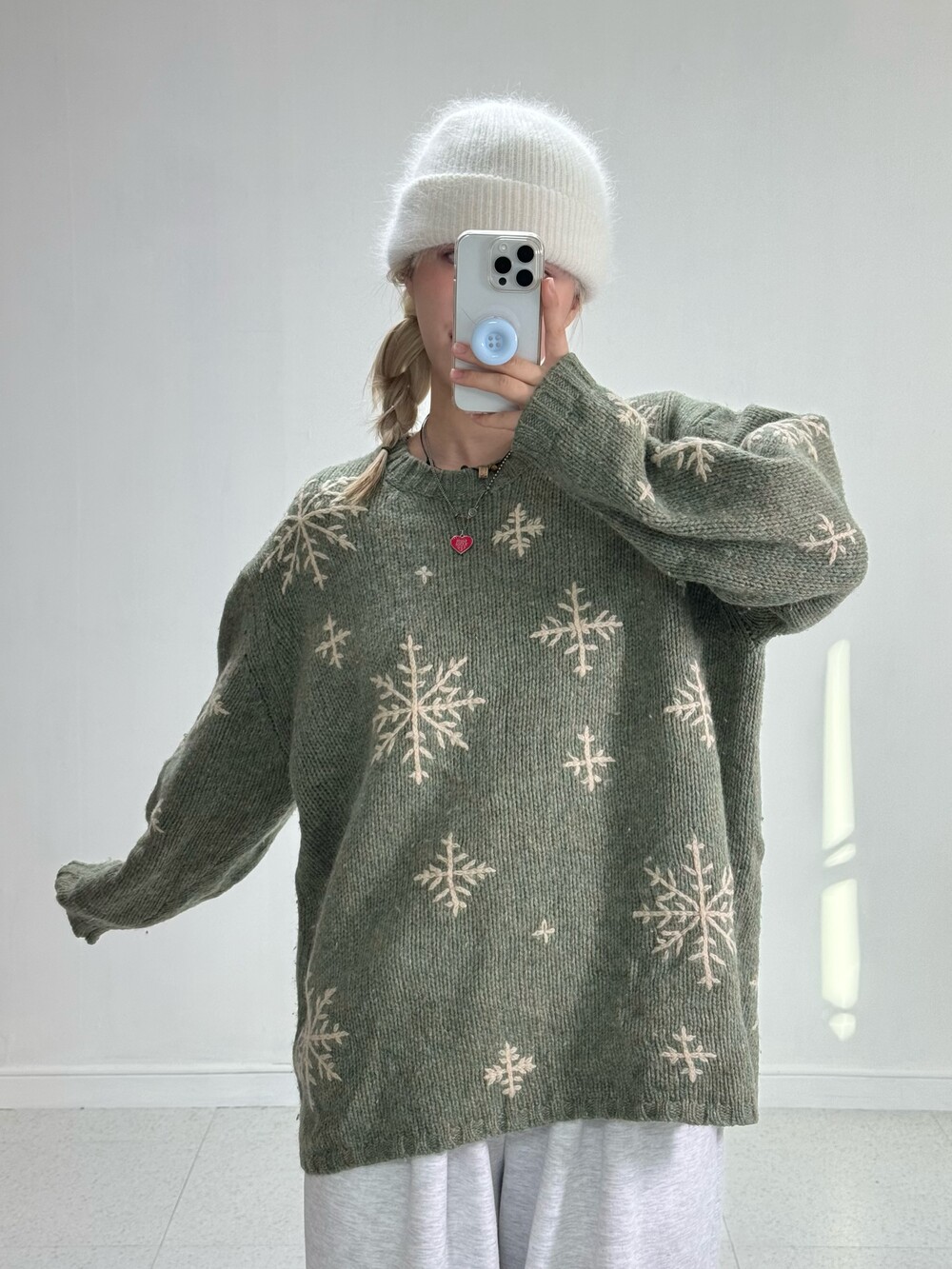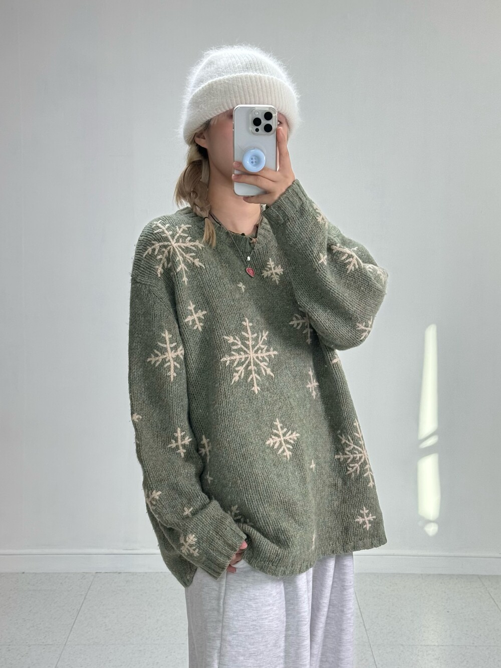 •빅눈꽃패턴 그린 노르딕 니트에요! 아방루즈핏 너어무 사랑스럽구요>,< 색감도 촌스러운 그린 컬러가 아닌 빈티지한 뮤트톤의 그린티 컬러라고 할까요- 완전 러블리..🖤
