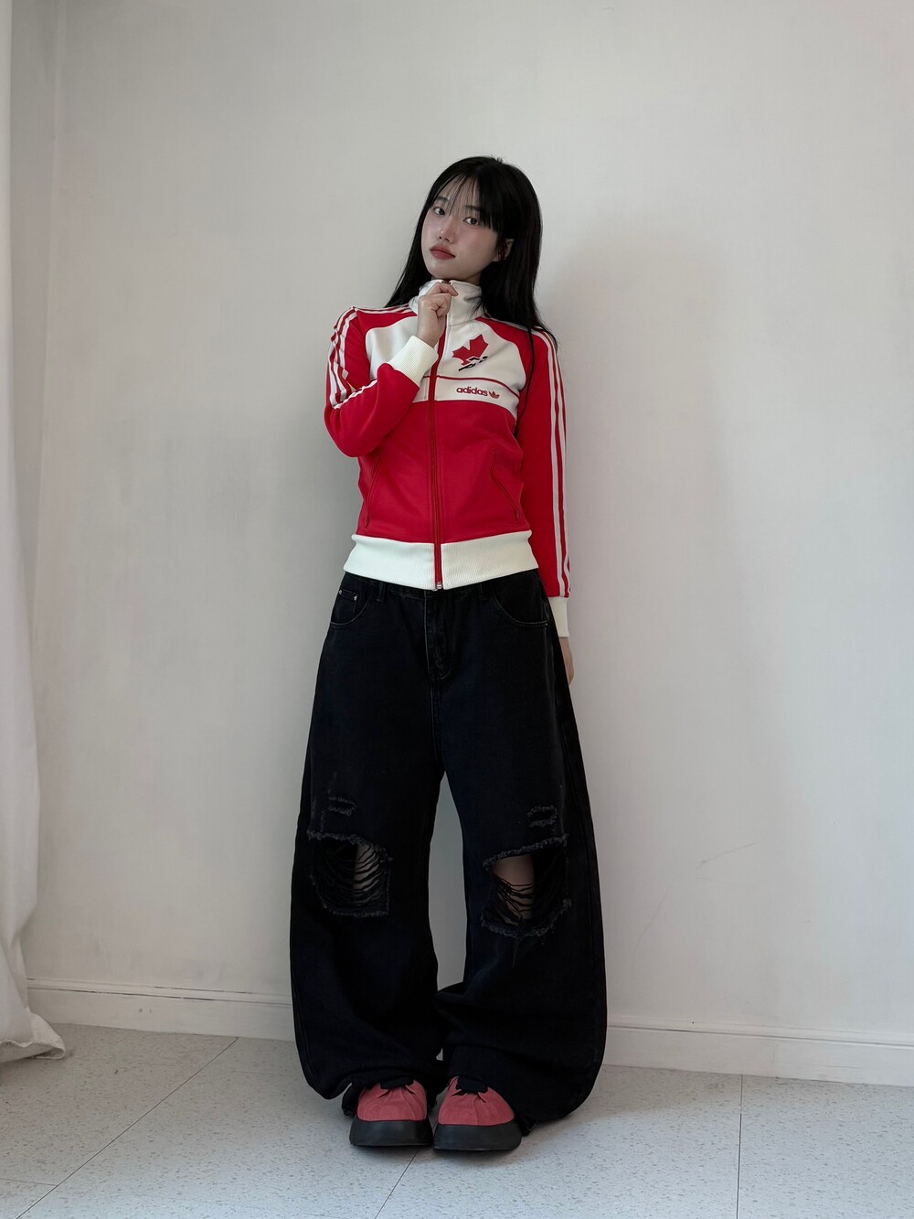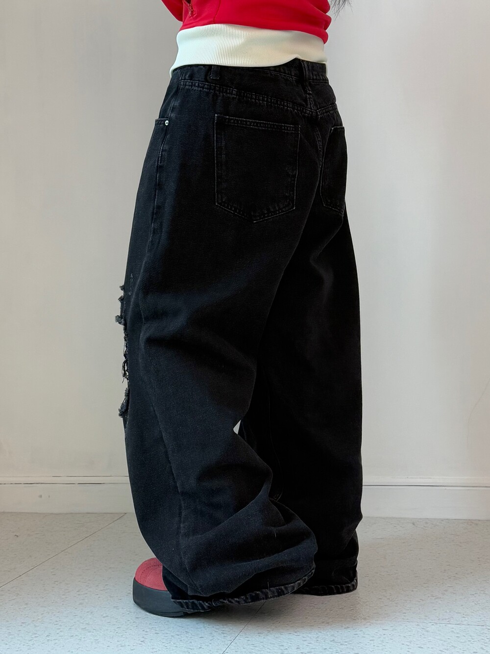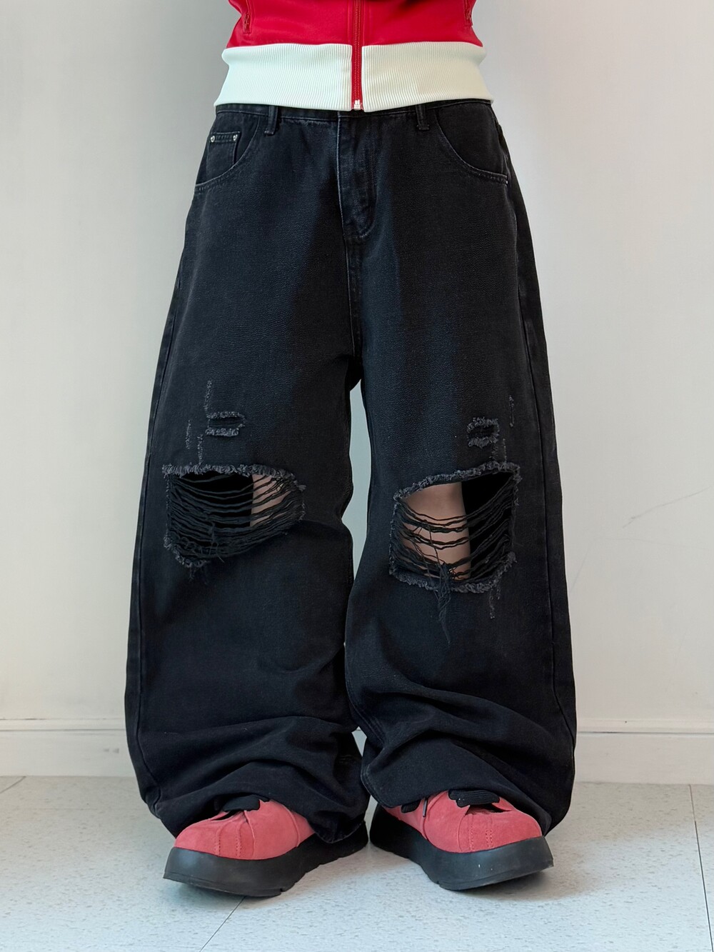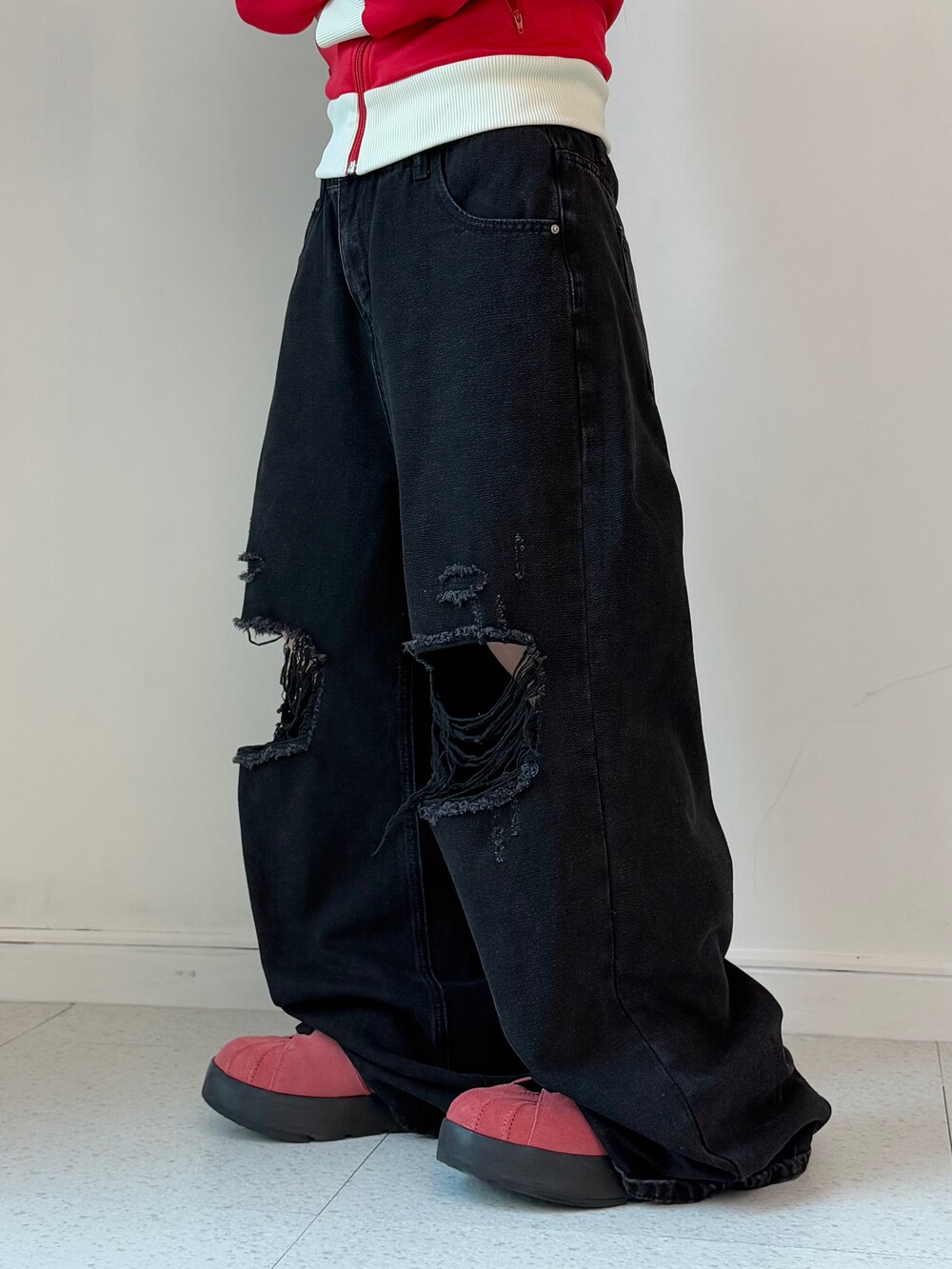•와이드핏에 무릎 데미지 디테일이 들어가있는 멋스러운 팬츠에요! 개인적으로 사계절 내내 즐겨주시기 좋은 힙한 팬츠인 것 같아유🖤
