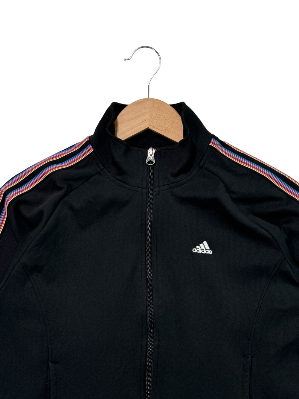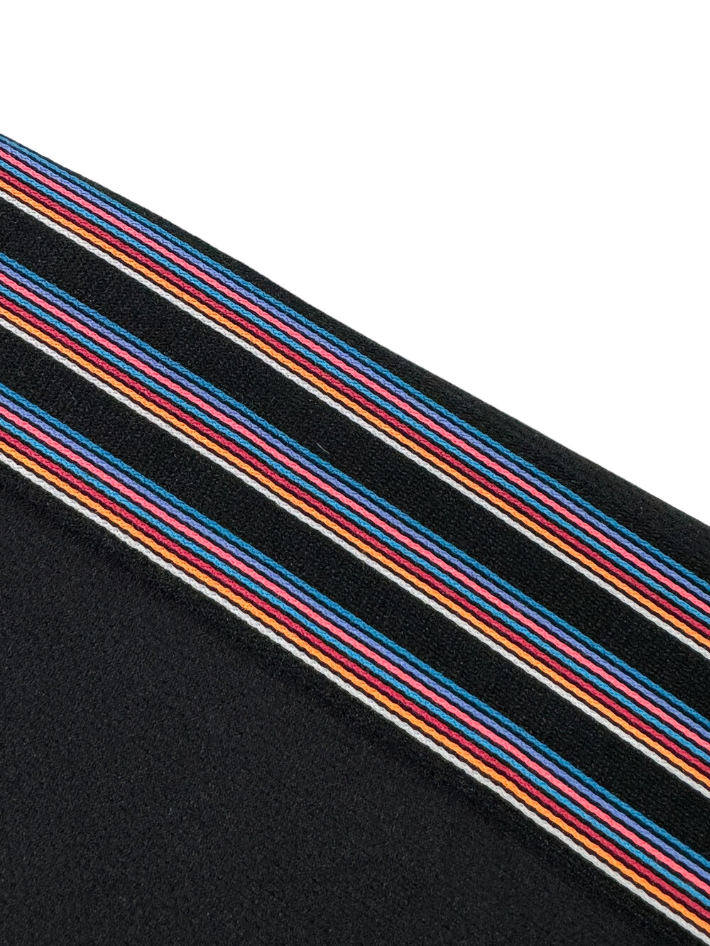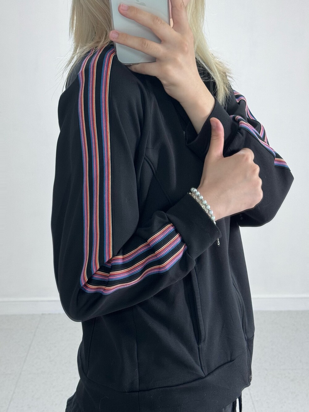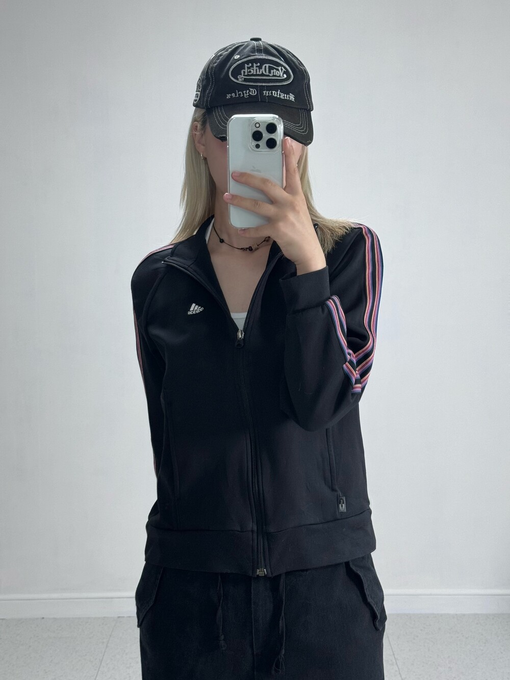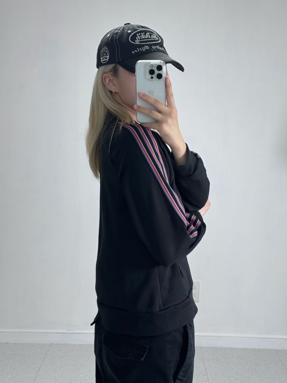 •요고 입구 까미랑 같이 산책갔다왔다구 게시물 올렸는데 저장 20개 넘었던 져지.. 블랙에 사이드라인이 레인보우 느낌으로 들어가있어 독특하고 올블랙룩에도 포인트로 착용해주기 좋은 져지에요ㅎㅎ 정핏으로 떨어지는 제품이라 깔끔포인트로 착용하기 추천 🖤