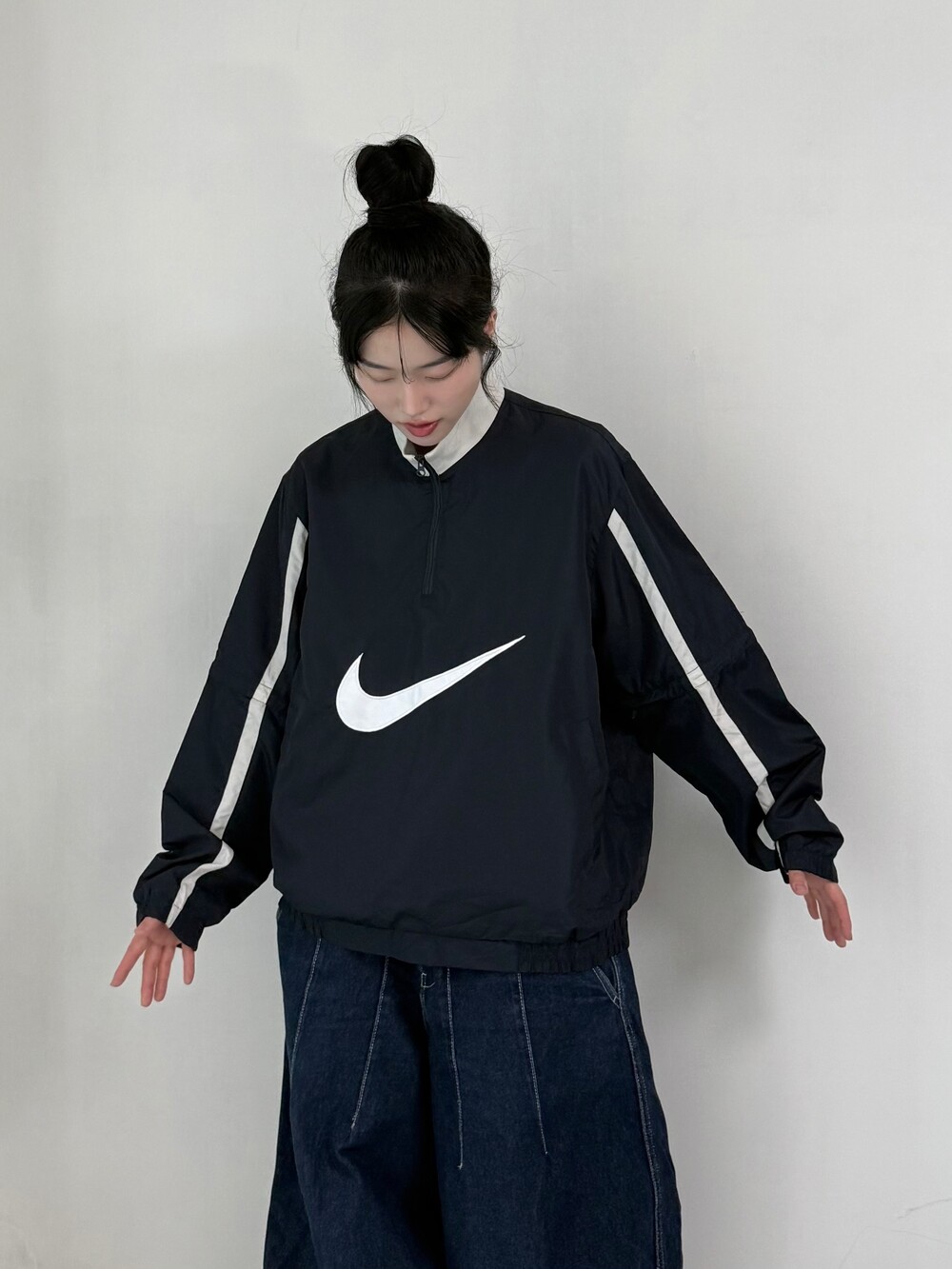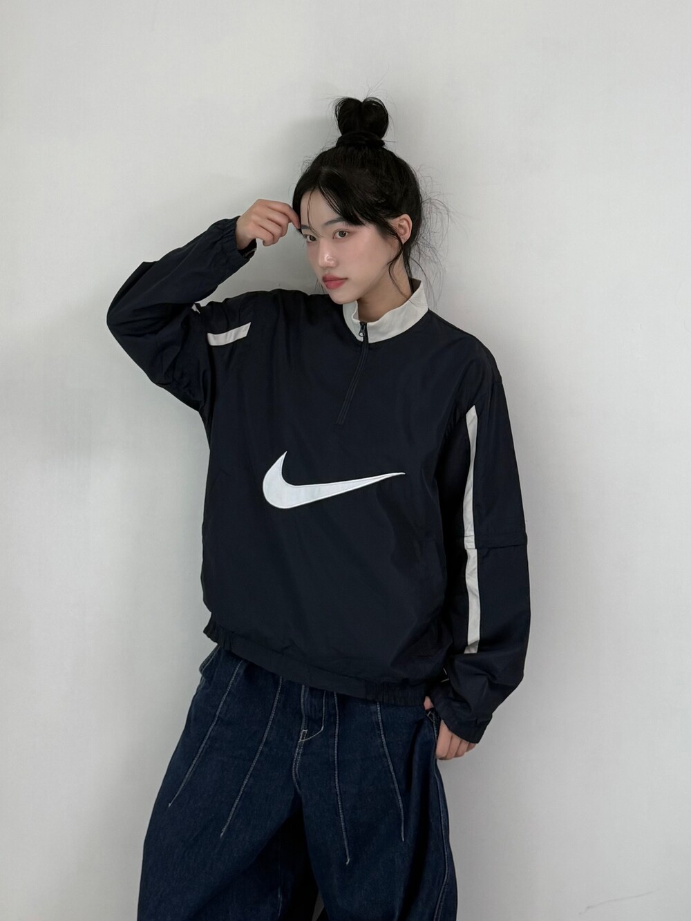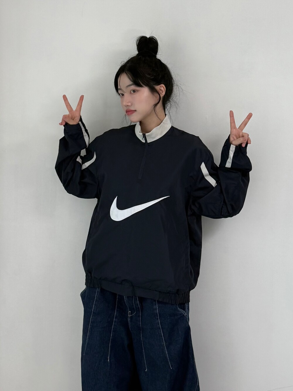 •나이키 올드스쿨 반집업 이에요! 네이비 컬러 + 빅스우시 로고 조합 미쳤숩니다..심지어 반팔로도 착용가능! 완전 요물 아닌가요ㅎㅎ