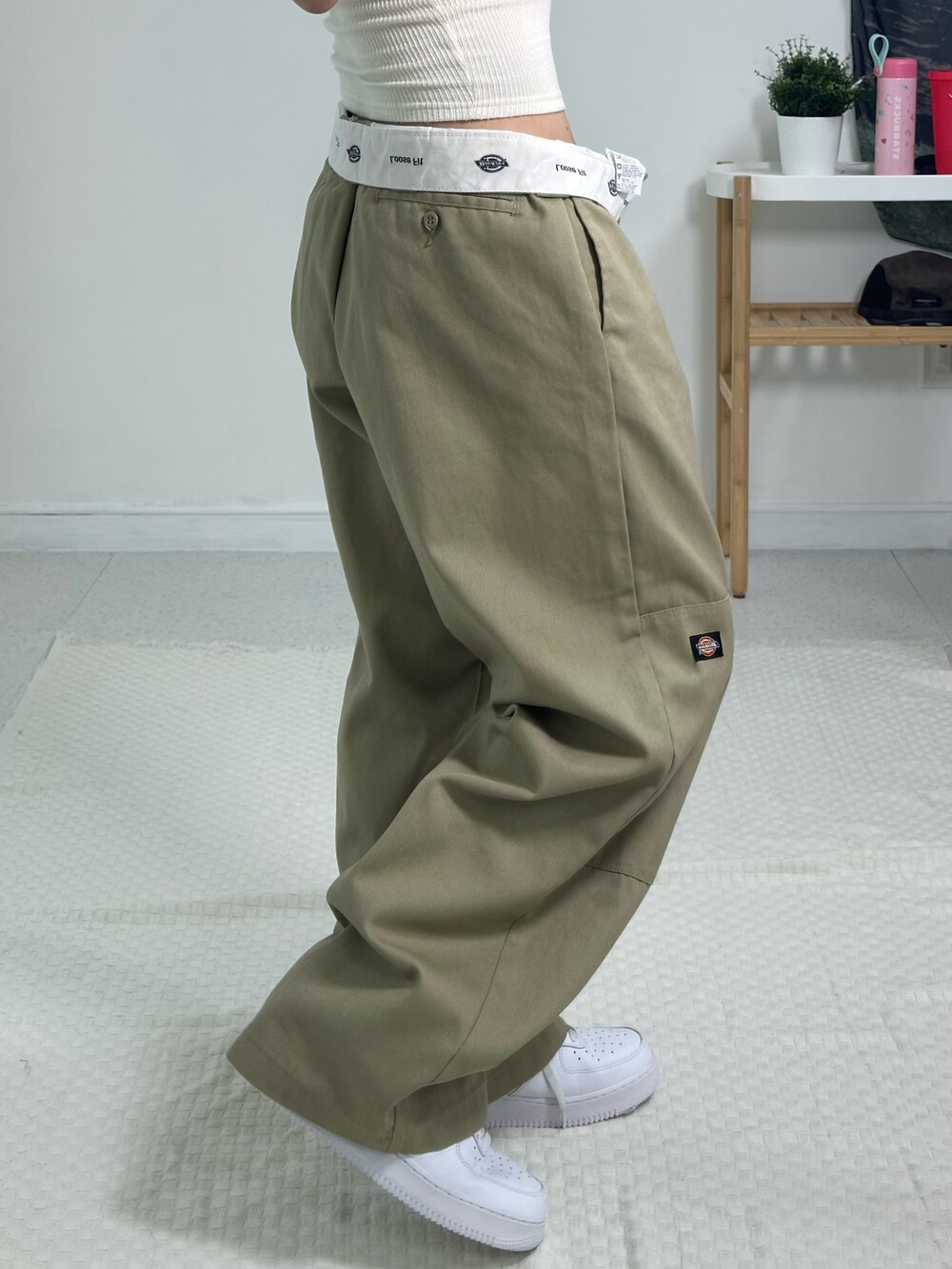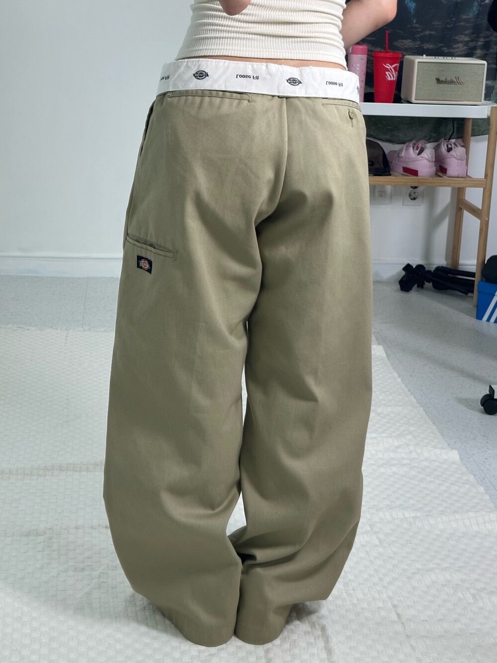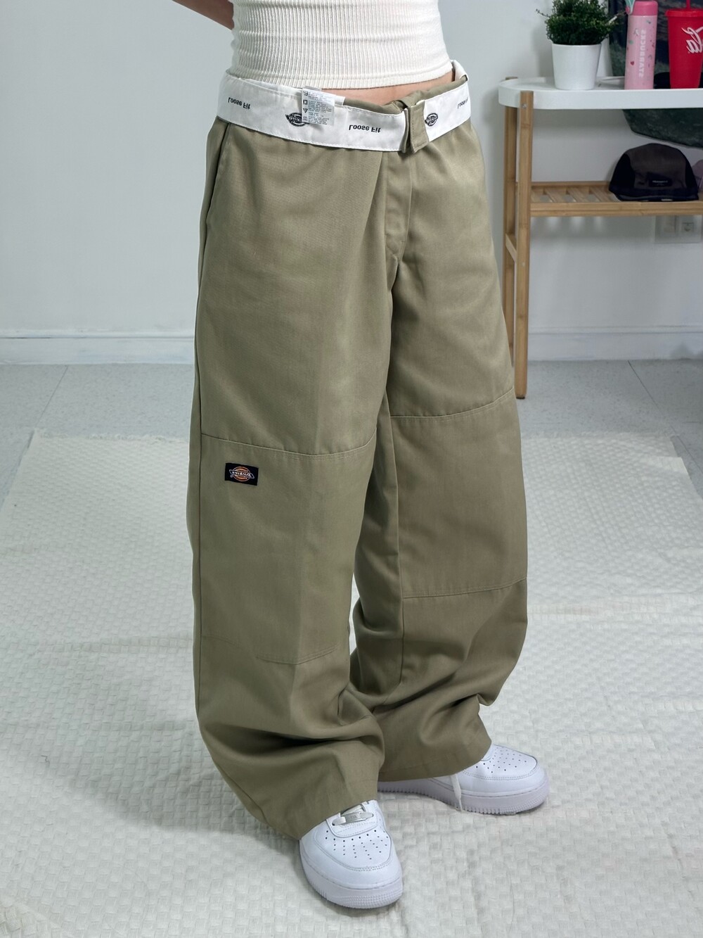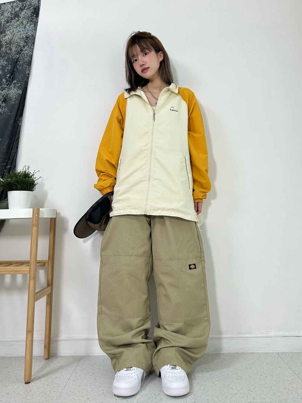 •와이드 루즈핏의 디키즈 팬츠에요! 원단 자체가 살짝 빳빳한 느낌이라 각잡힌 실루엣이 너무 멋스러운 제품입니다:) 단독으로 보았을때 보다 코디해서 착용했을때가 더 예뻐서 자신있게 추천 드립니다!