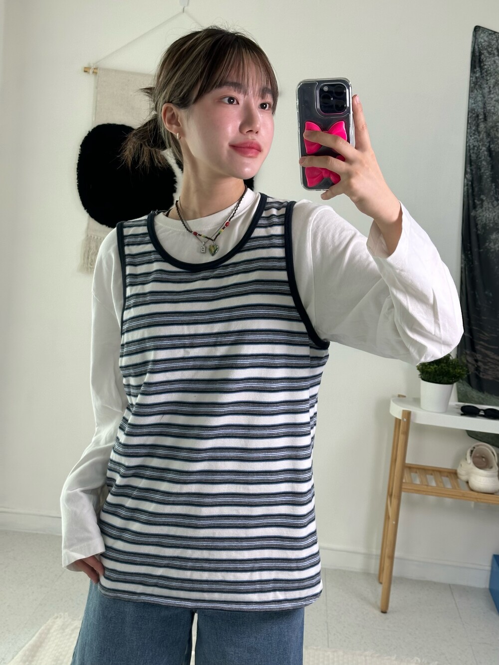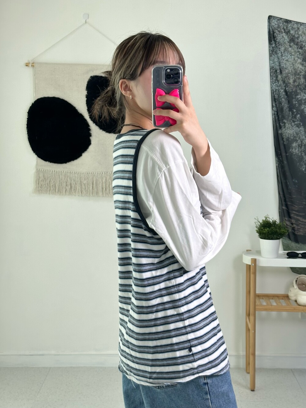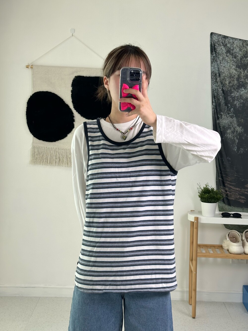•색감도 핏고 얼마나 귀여운지요? 블루와 화이트 스트라이프가 있어 더욱 귀엽고 시원하게 코디해주기 좋아요✌🏻 여름에는 단독으로 편안하게 연출해주시고 가을 겨울에는 베스트 느낌으로 레이어드 해서 착용해주시길 추천드려요! 사계절 내내 입을 수 있는 아이템><