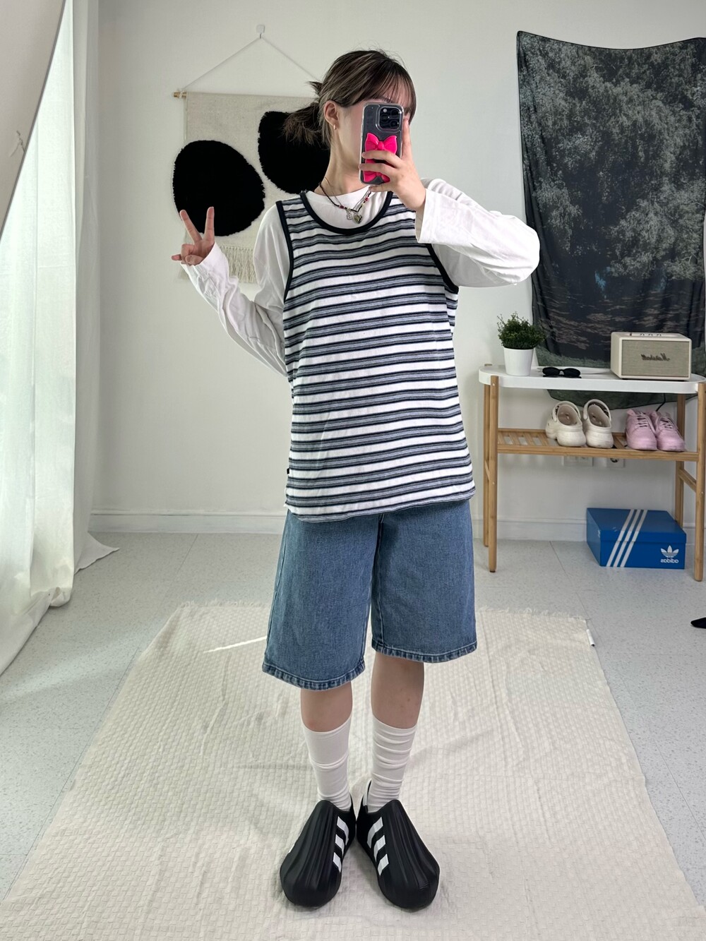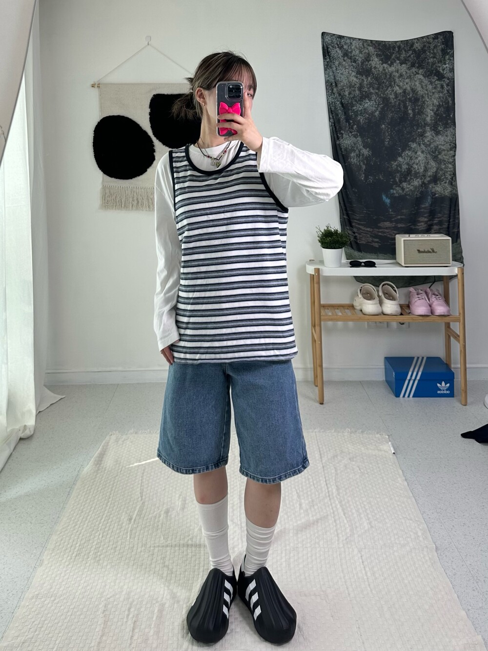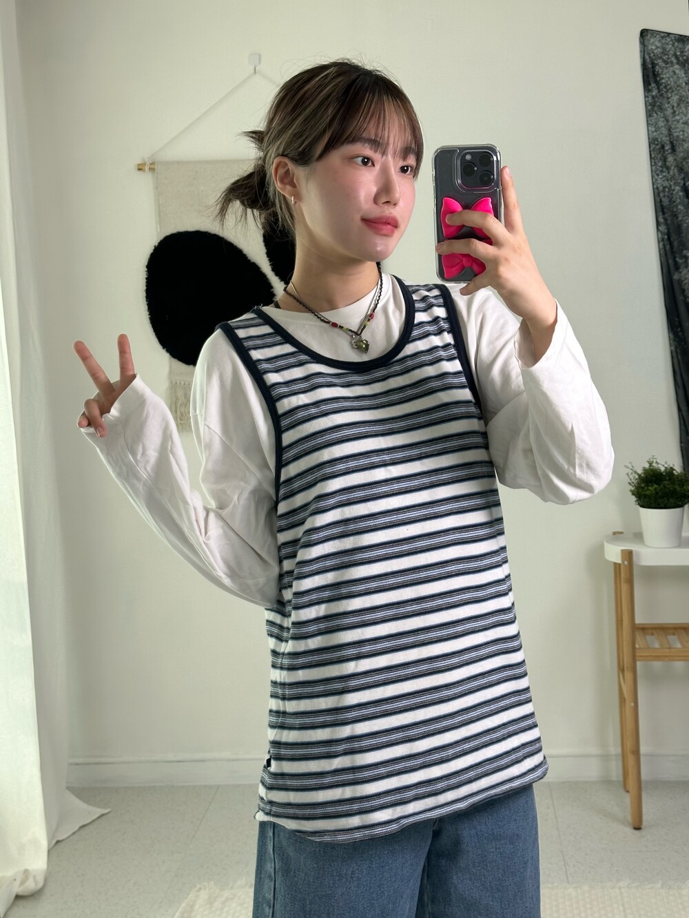 •색감도 핏고 얼마나 귀여운지요? 블루와 화이트 스트라이프가 있어 더욱 귀엽고 시원하게 코디해주기 좋아요✌🏻 여름에는 단독으로 편안하게 연출해주시고 가을 겨울에는 베스트 느낌으로 레이어드 해서 착용해주시길 추천드려요! 사계절 내내 입을 수 있는 아이템><