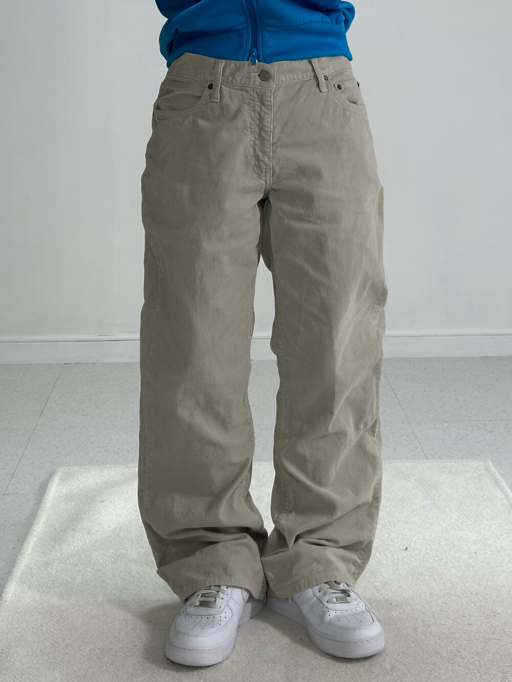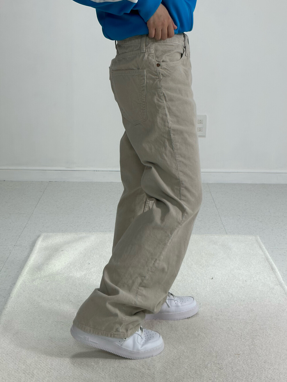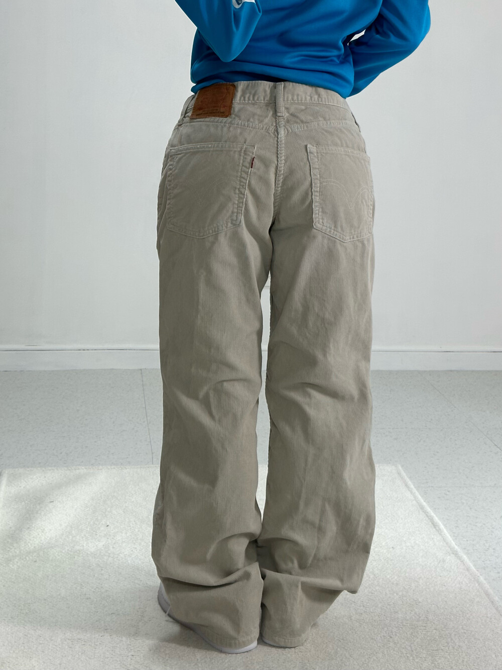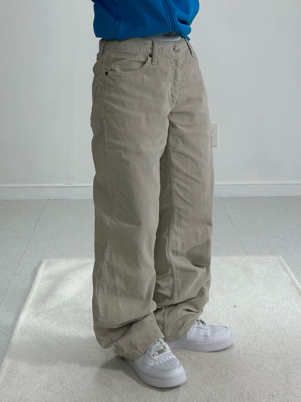 •아이보리 컬러 리바이스 코듀로이 팬츠에요! 로우라이즈로 입어주시는 제품이고 갈수록 와이드해지는 실루엣이라 롱다리로 만들어주더라구요!>,<