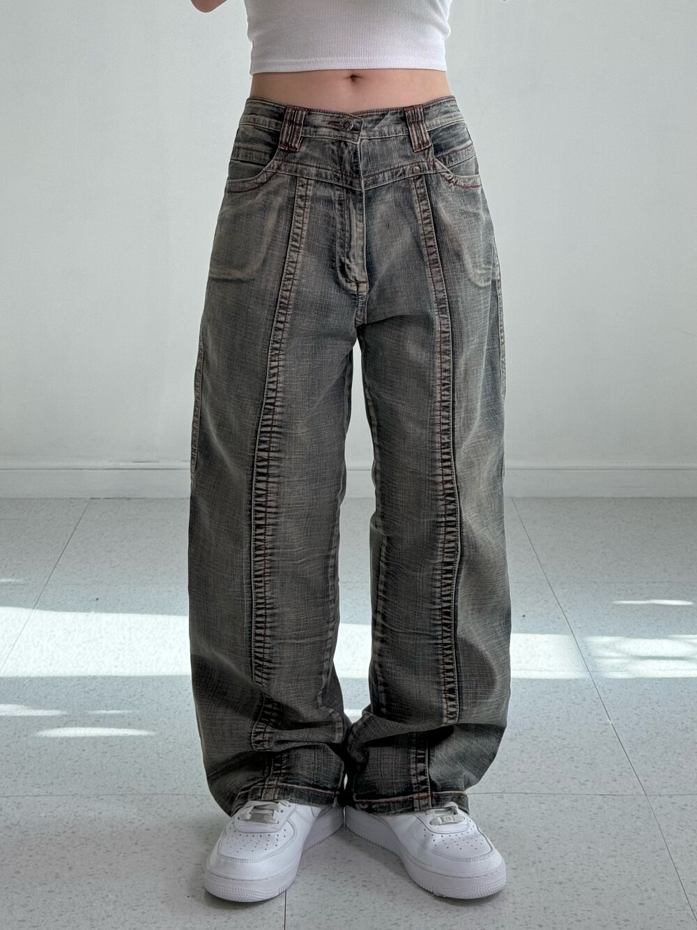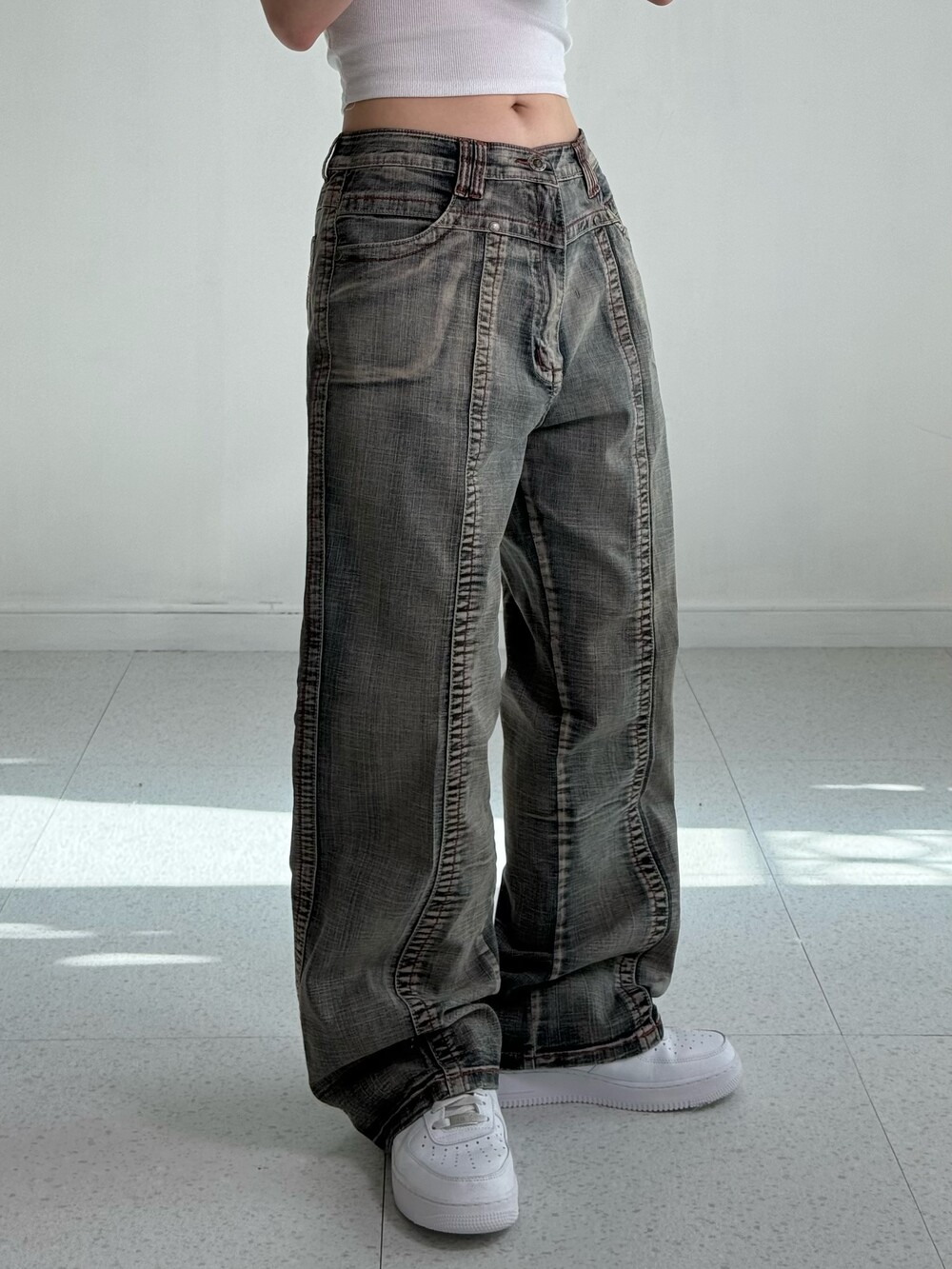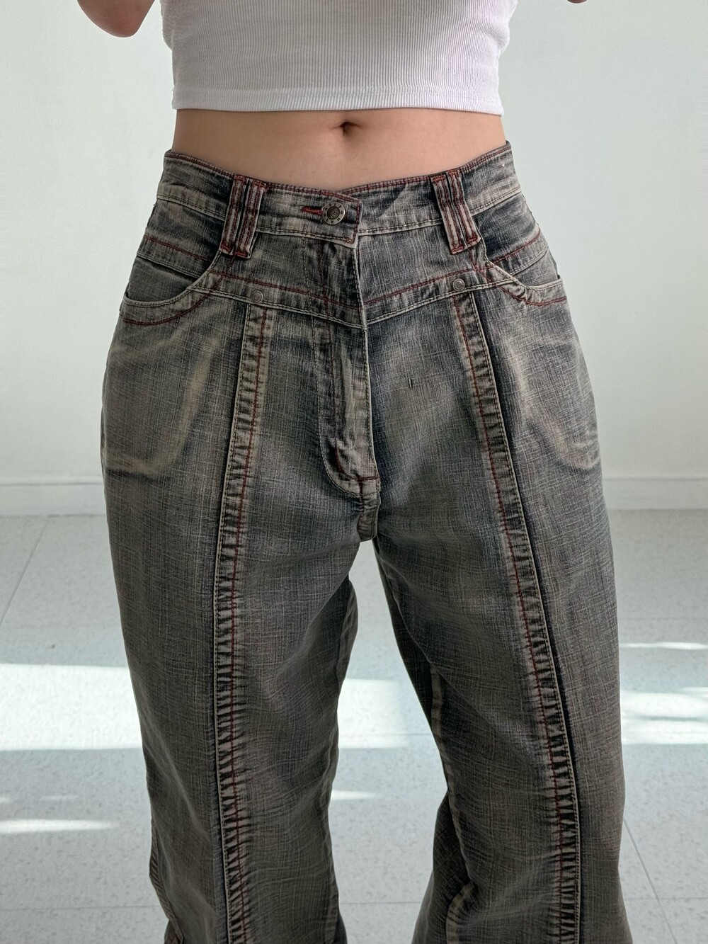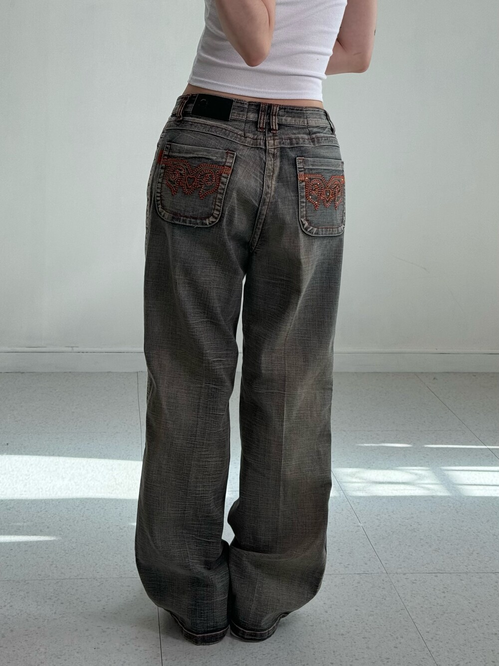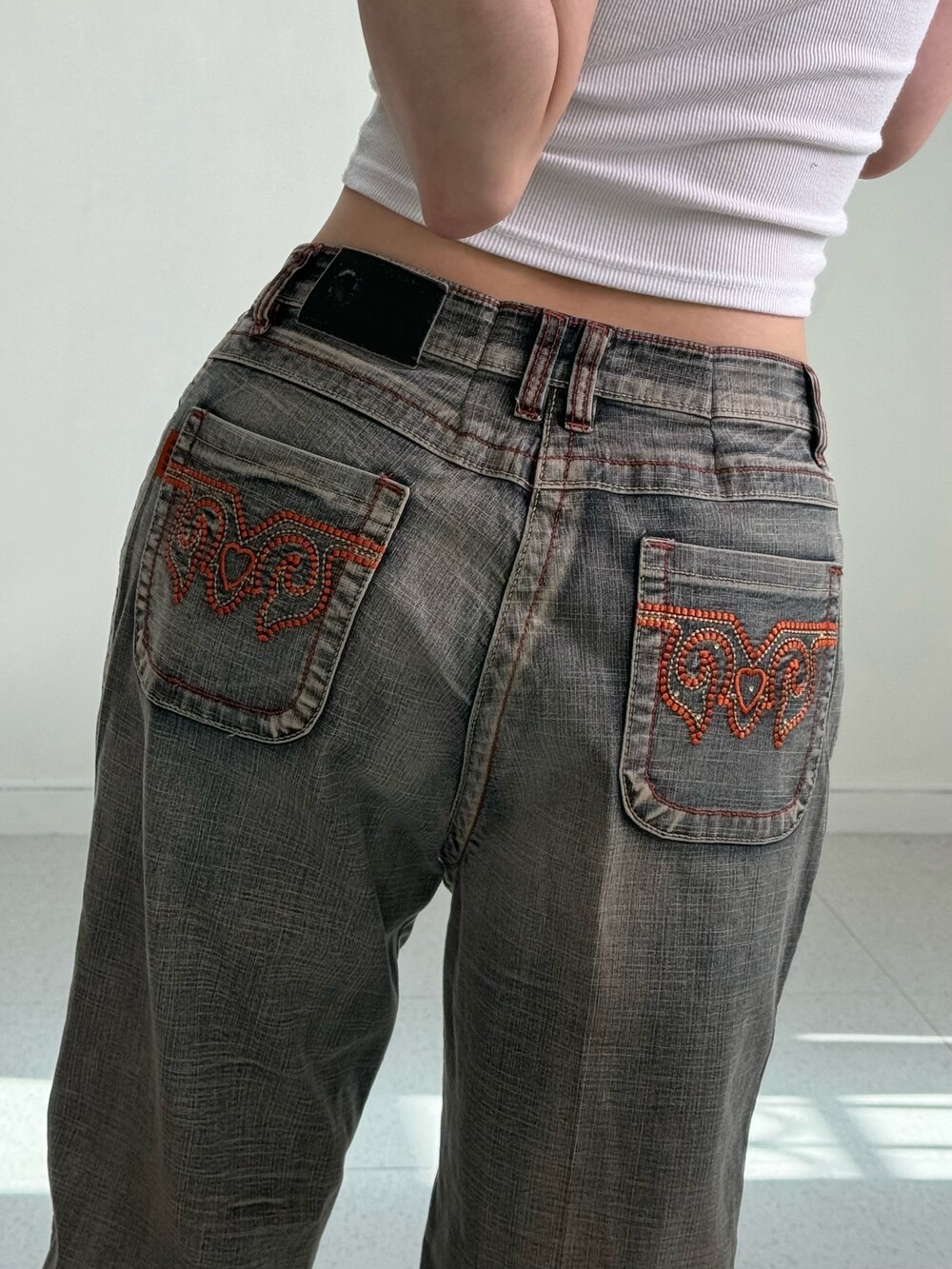 •빈티지한 색감과 디자인이 매력적인 데님 워싱 팬츠에요! 엉덩이 자수 디테일 좀 봐주셔요 ..🖤