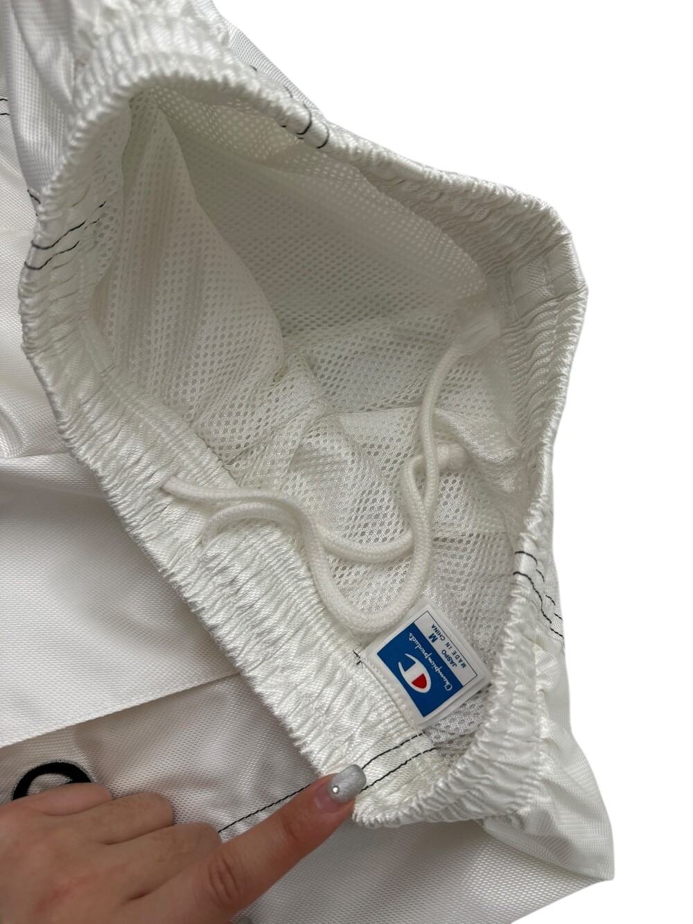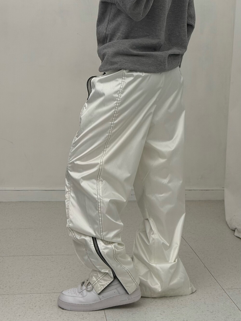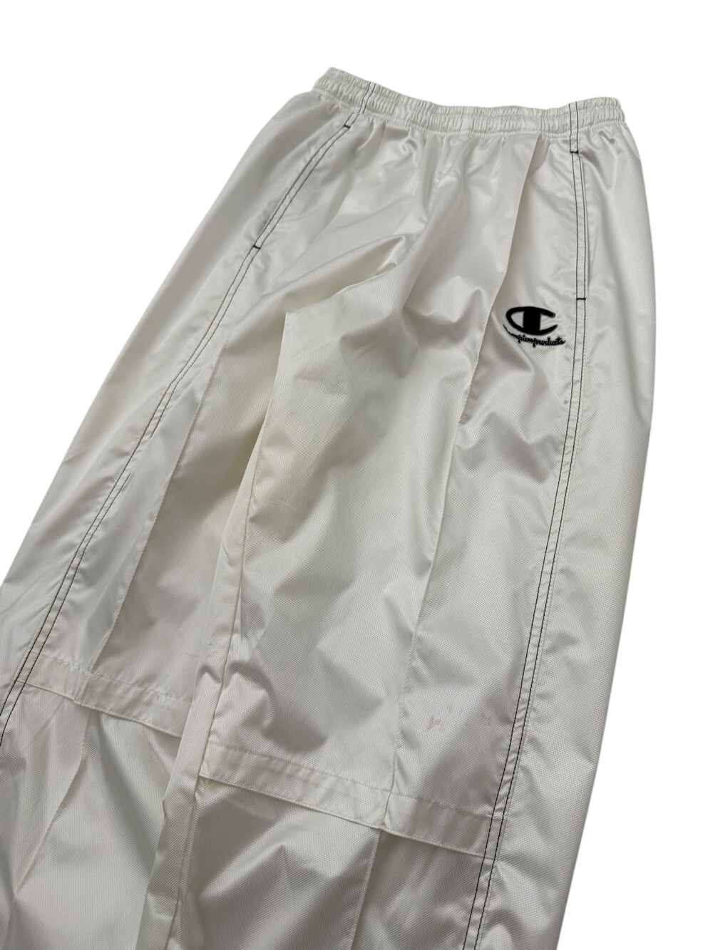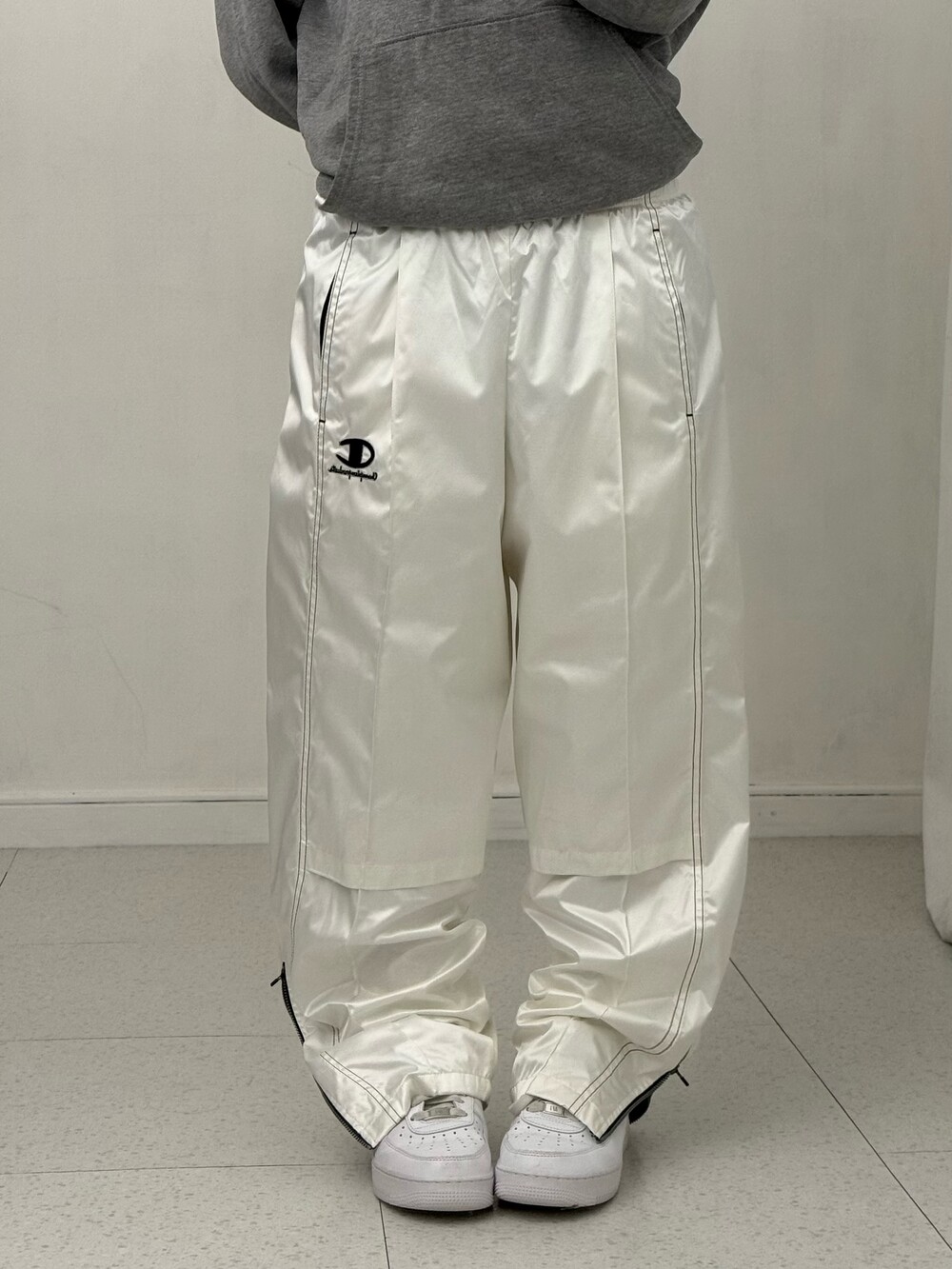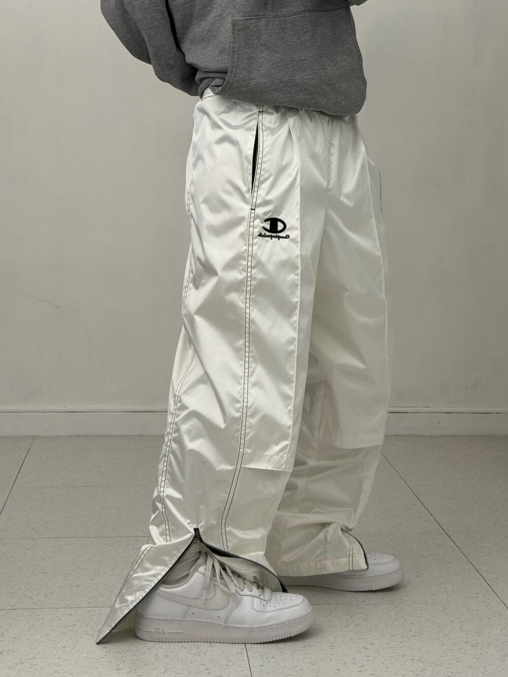•챔피온 화이트 트랙팬츠 입니다. 살짝 광택감이 느껴지는 원단이라 더 멋있어요!