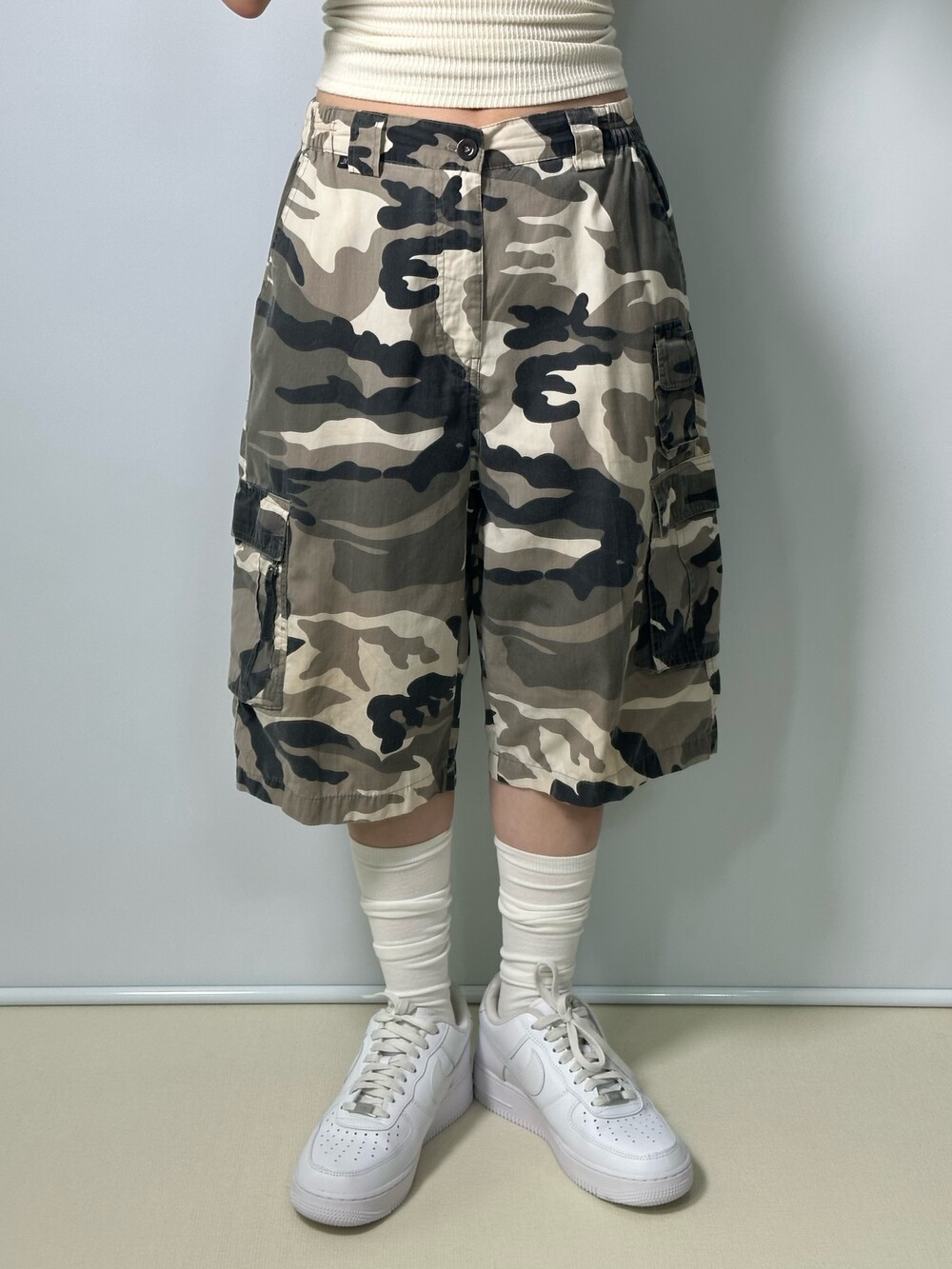 •앞에 미니포켓 디자인이 마음에 들었던 카모카고 반바지에요! 폭작한 베이지 톤 느낌의 카모 디자인이라 흔하지 않은 색감이라고 생각해요! 허리는 부분밴딩이라 편안하게 착용가능하셔요>,<