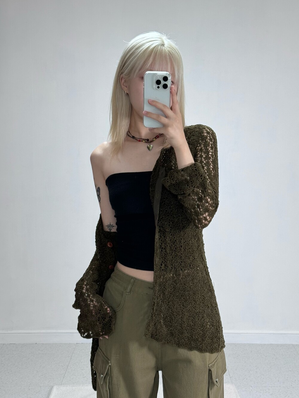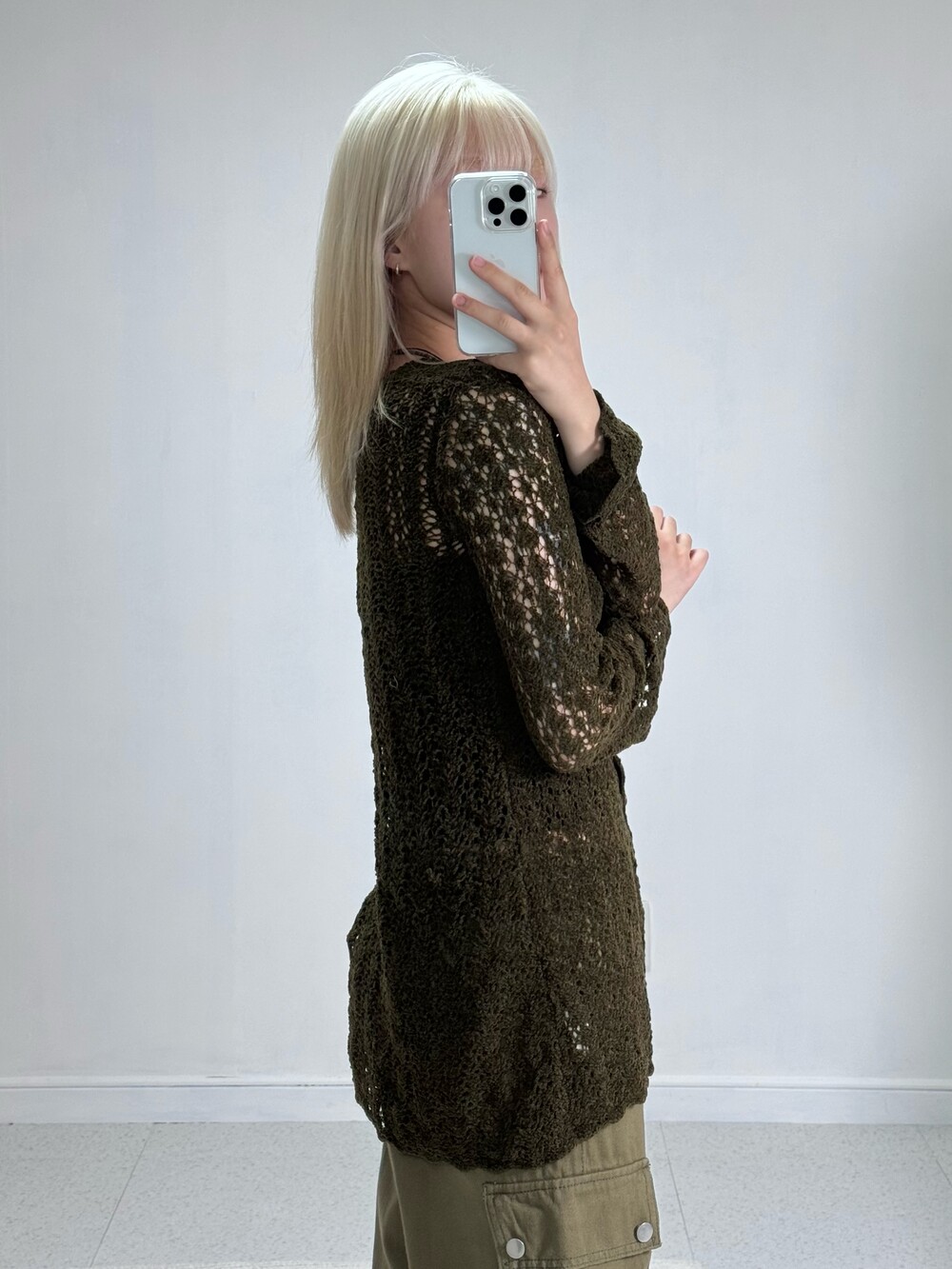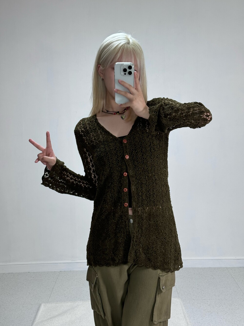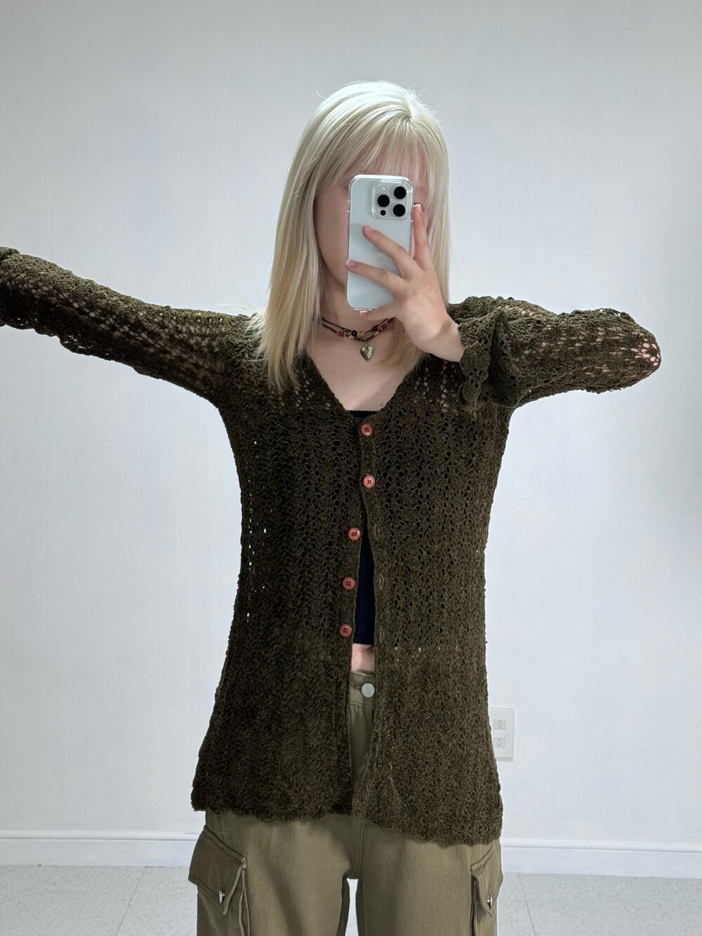 •44-66사이즈 모두 착용하실 수 있는 스판 짱짱한 카키니트 가디건이에요 ㅎㅎ 그런지,빈티지한 무드와 섹시한 무드까지 함께 공존하는 제품이라 활용성 아주 굿 입니다🖤