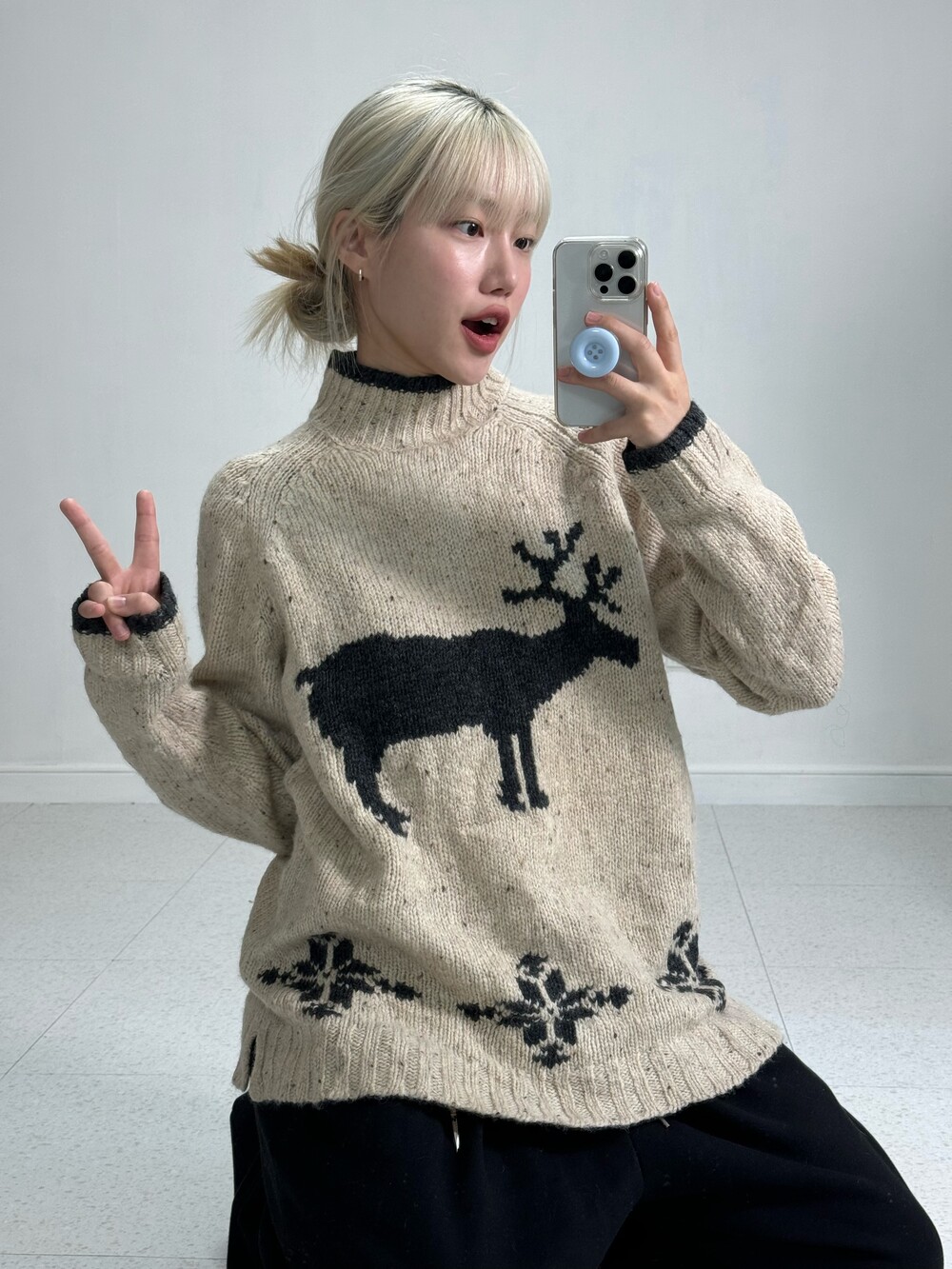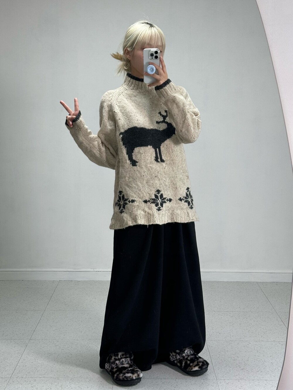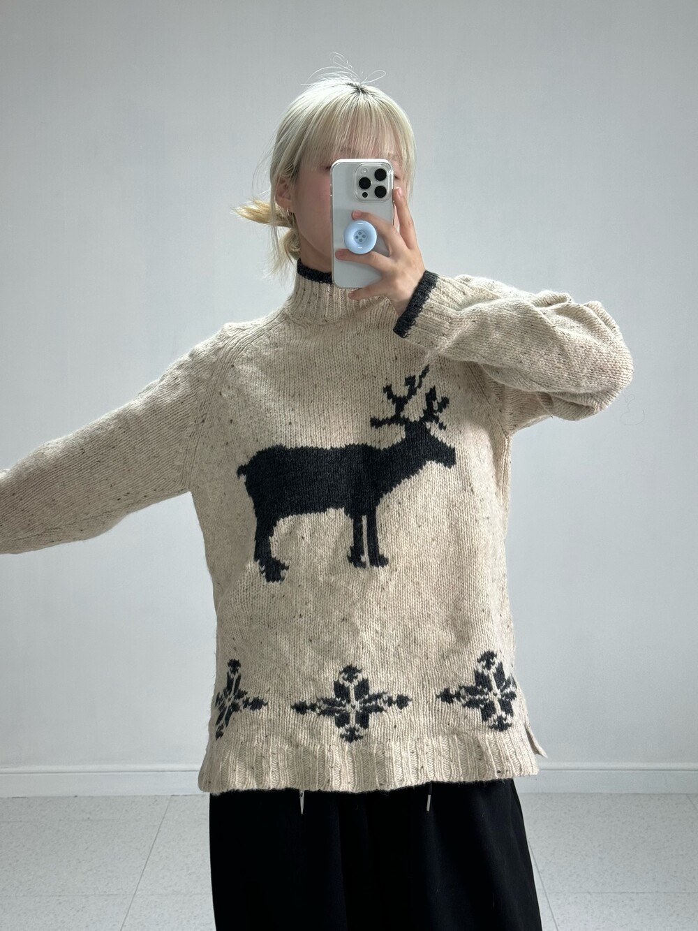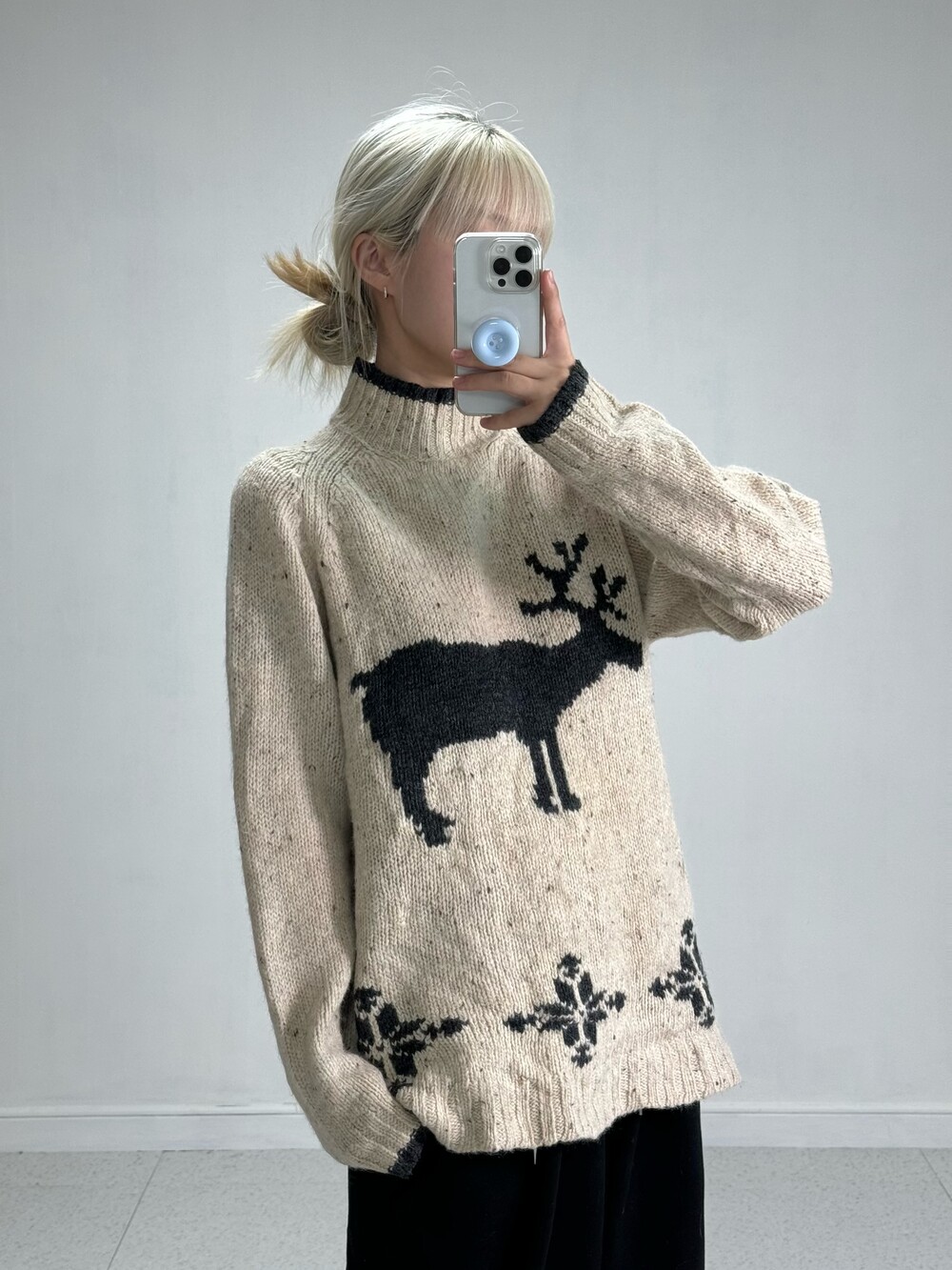 •베이지 오트밀 느낌에 블랙으로 사슴이 들어가있는,, 정말 완벽하고 사랑스러운 니트에요! 루즈한핏에 완벽한 반폴라 디자인 아이템 이랍니다 🖤